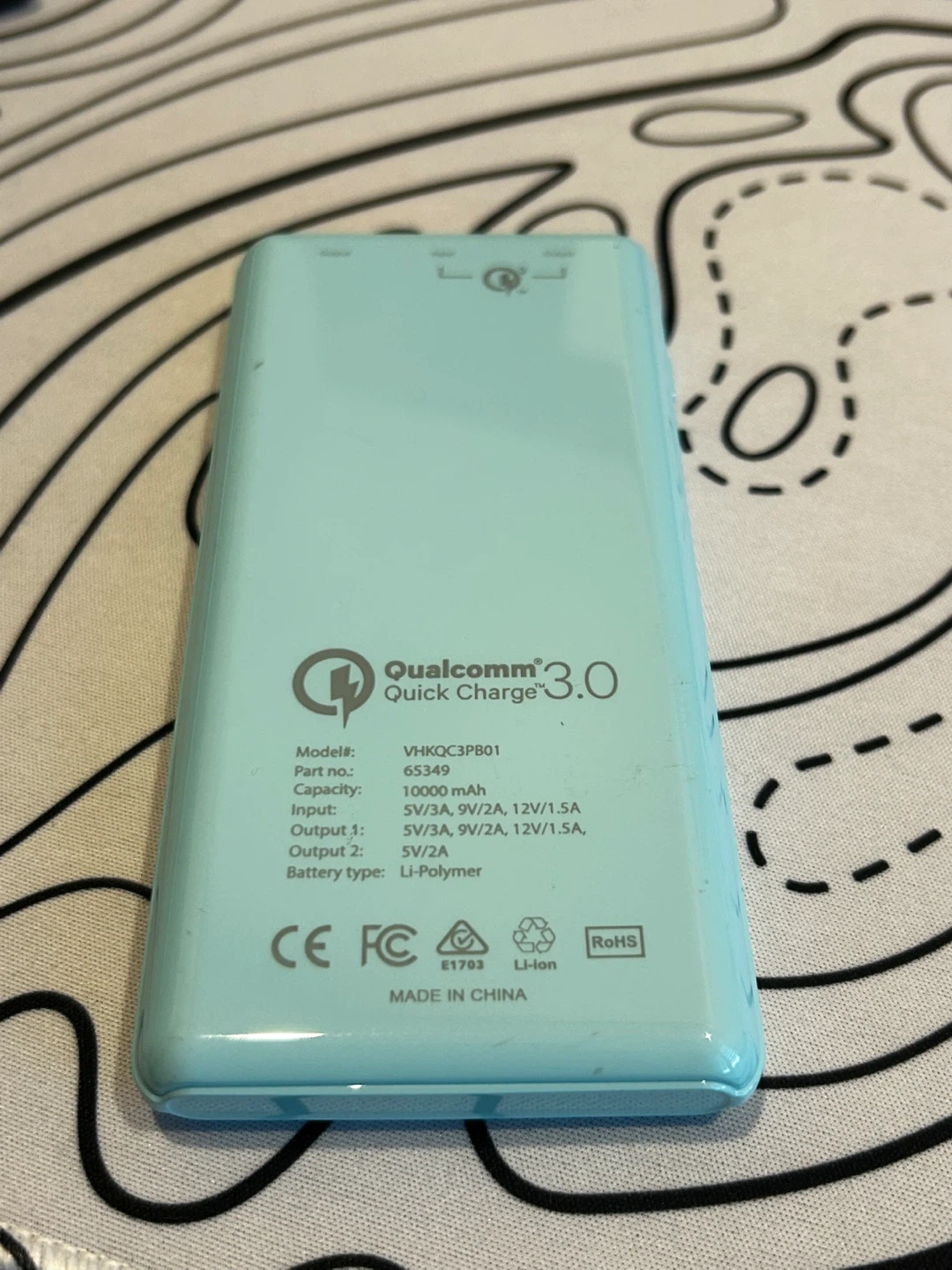 Verbatim 10000mAh power bank. It supports Qualcomm Quick Charge 3.0. Includes two USB-A output ports and one micro-USB input port. Li-Polymer battery type.