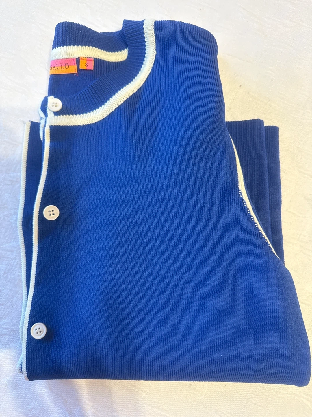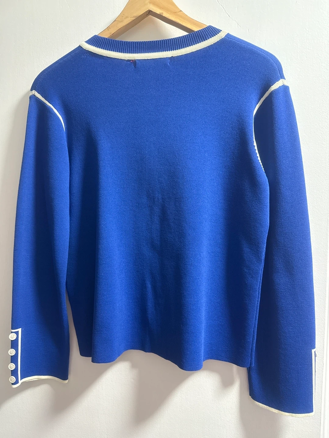 Vilagallo blue knit cardigan with cream trim. Features a crew neck, button front, and faux pocket details. Size S.