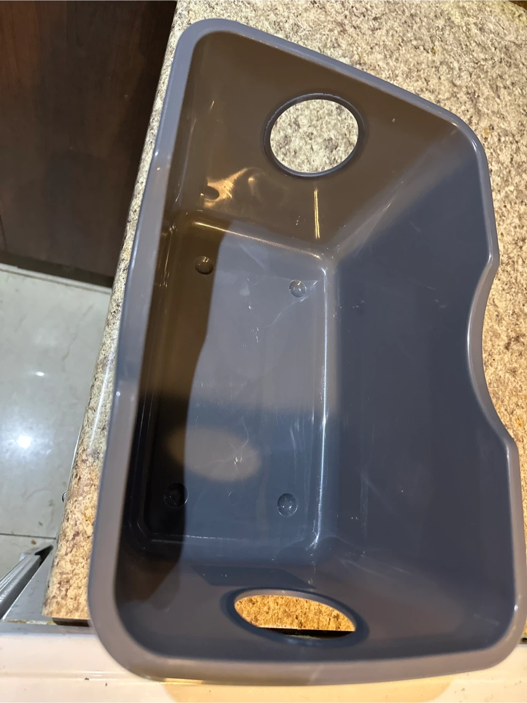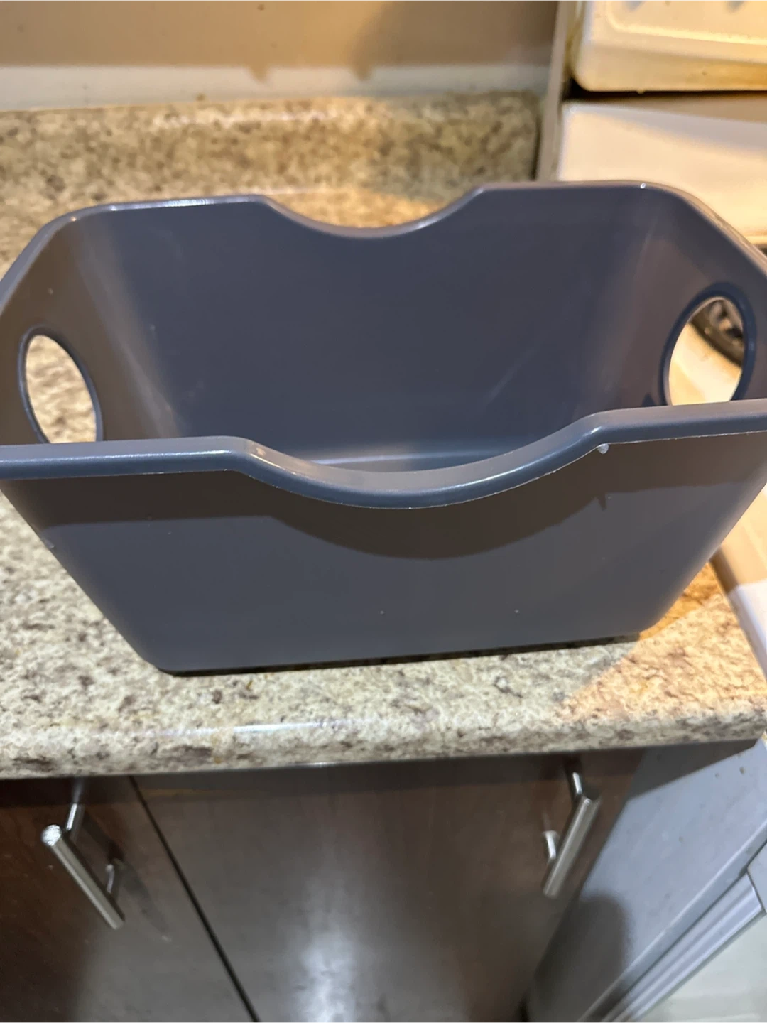 This is a grey plastic caddy organizer bin. It has cut-out handles on each side for easy carrying. Great for organizing cleaning supplies or small items.