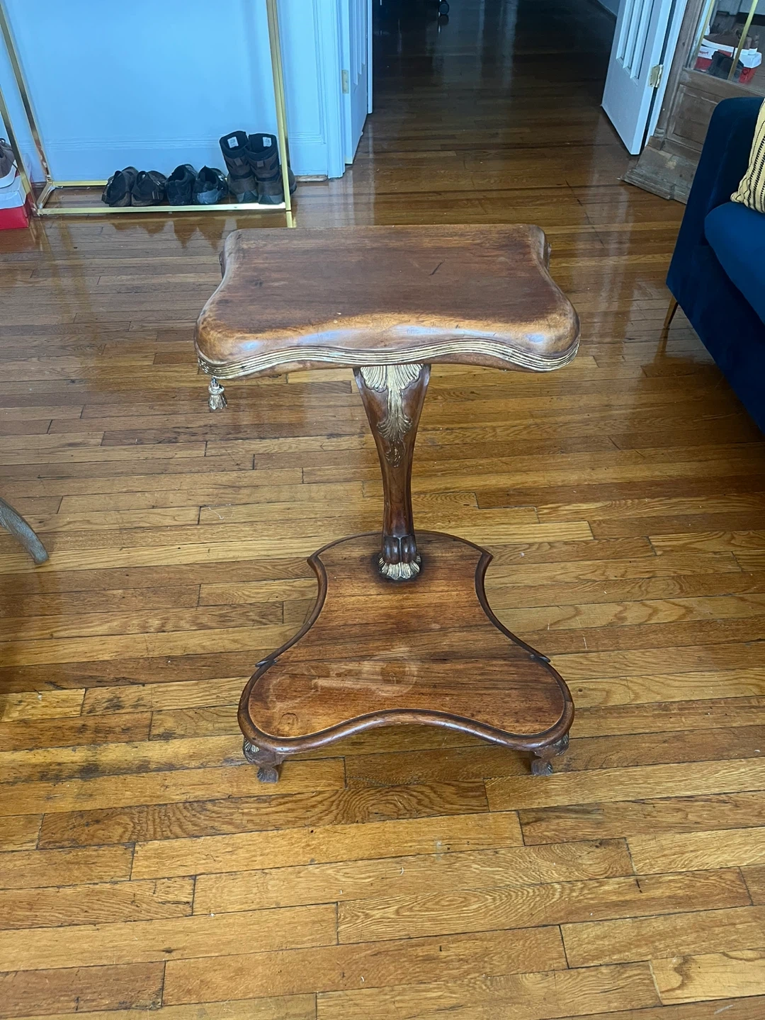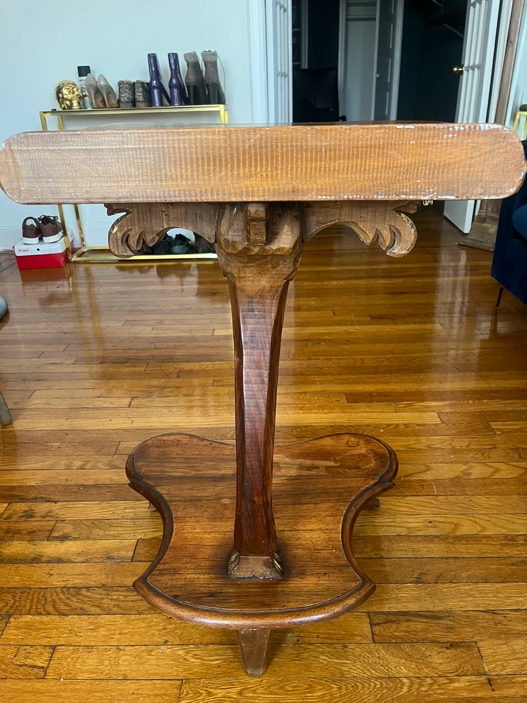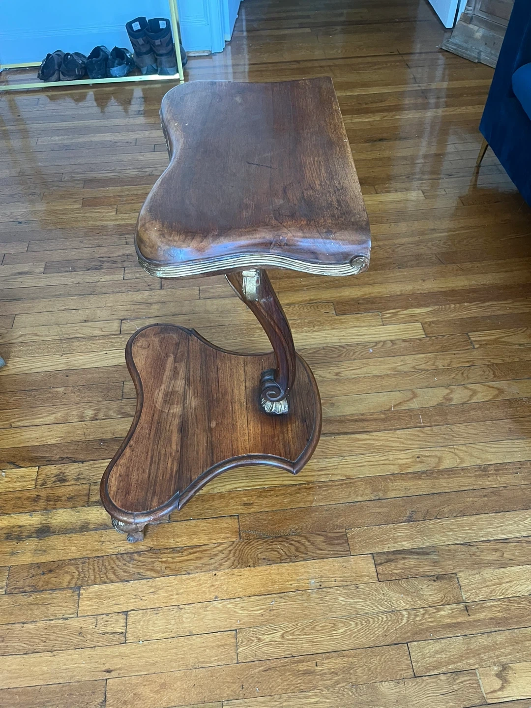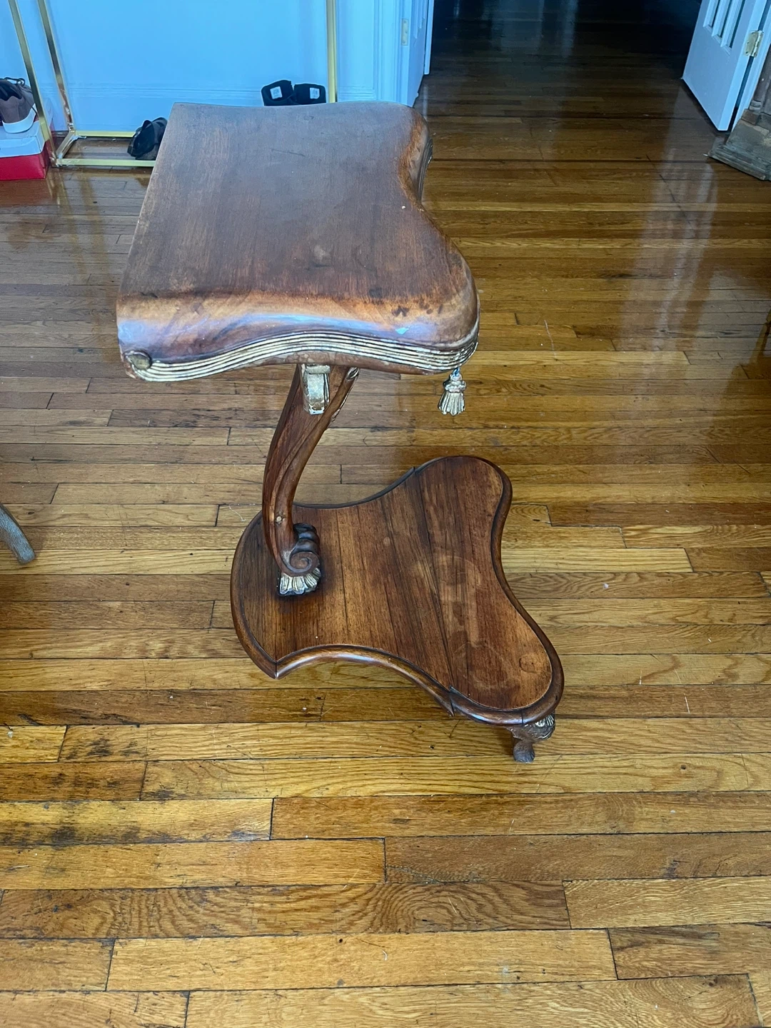 This vintage pedestal stand is crafted from wood with ornate carved details and gold accents. Its unique curved base and top add a decorative touch. It's perfect for displaying plants or decorative items or praying. Lol. My father is a woodworker. He didn’t make this, but he loves collecting beautiful things. He gave it to me, but I have no use for it. One of the tassels is missing and there is some water stains, but it is quite lovely to look at.