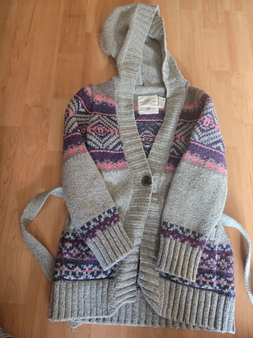 This H&M L.O.G.G. hooded cardigan features a grey base with a colourful geometric pattern. It's made for timeless apparel. Size US 4-6Y, EUR 110/116.