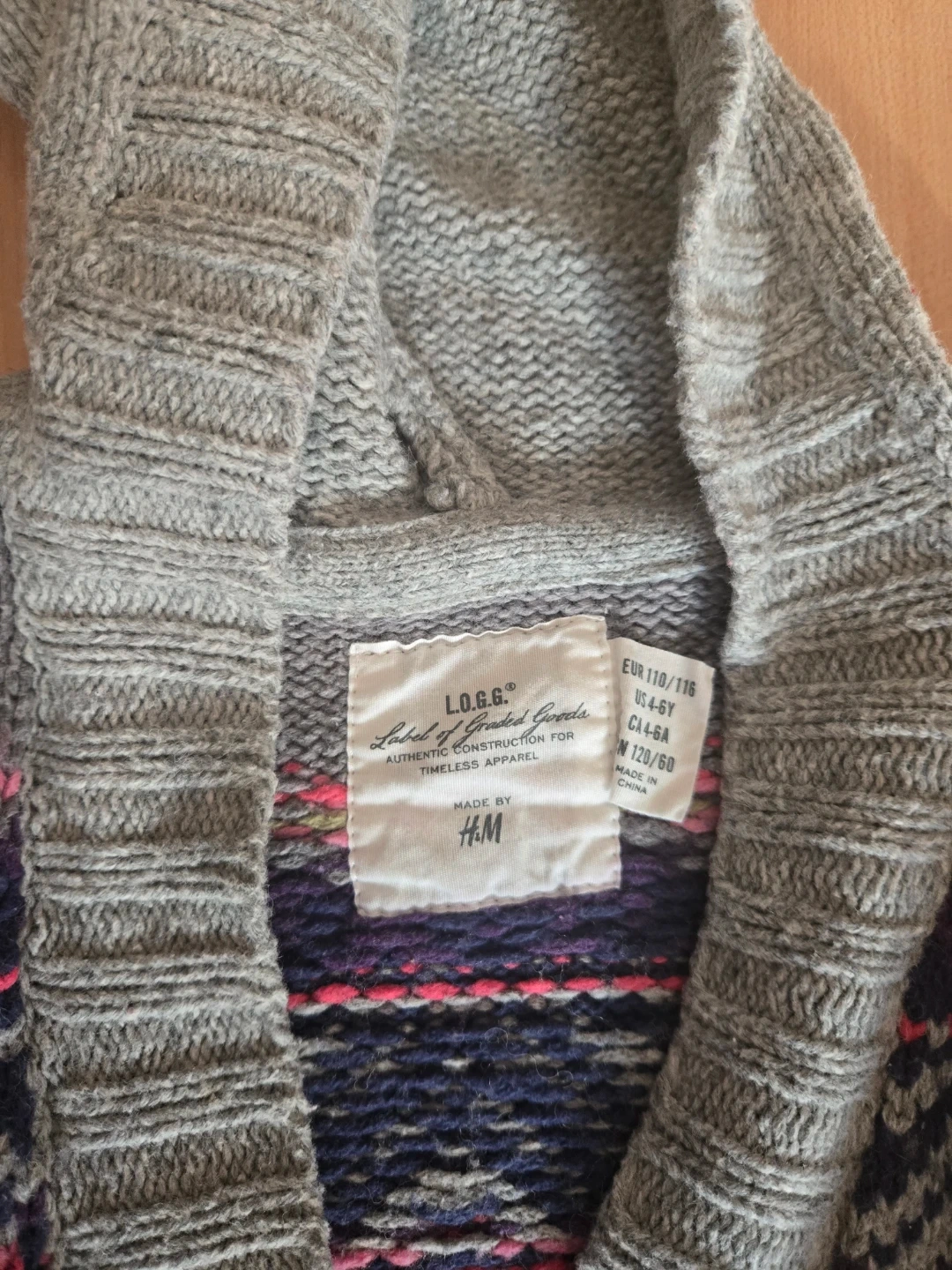 This H&M L.O.G.G. hooded cardigan features a grey base with a colourful geometric pattern. It's made for timeless apparel. Size US 4-6Y, EUR 110/116.
