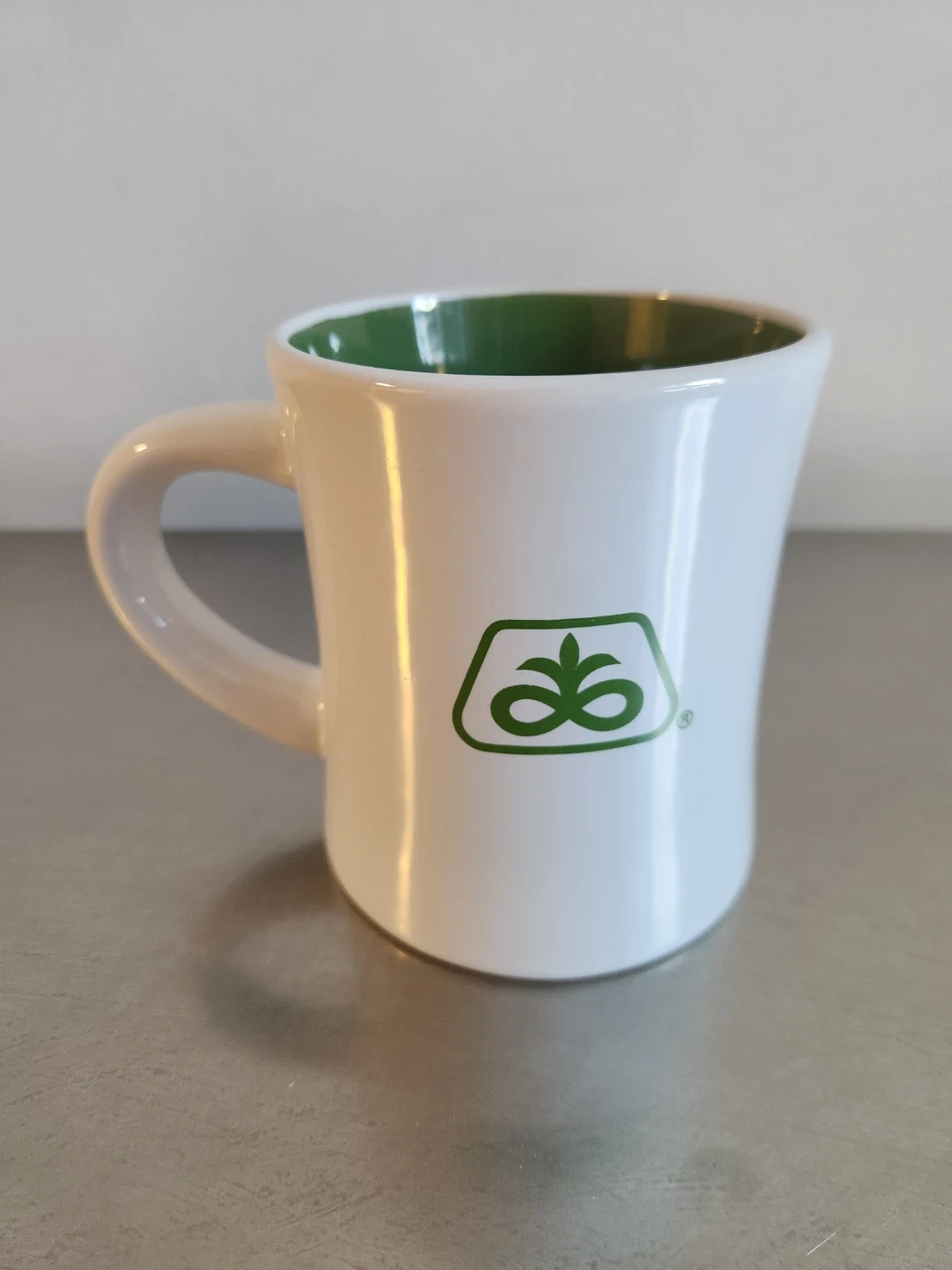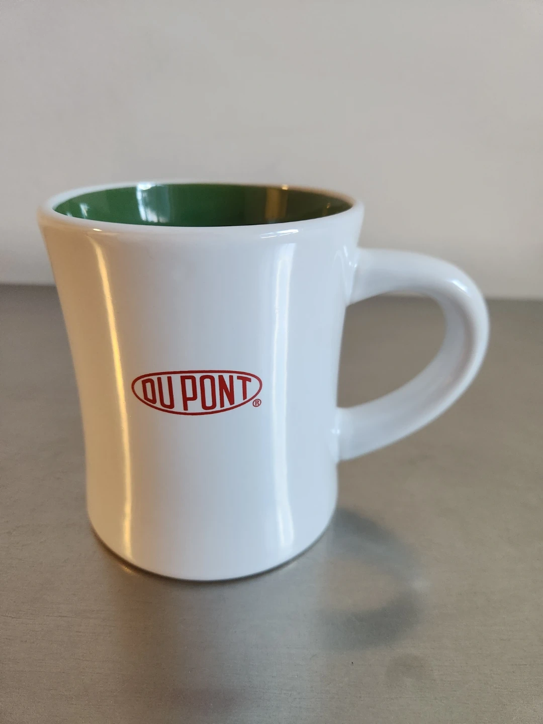 White ceramic coffee mug with a green interior. Features the DuPont logo and a Pioneer Hi-Bred logo. It's a sturdy mug for your favourite beverage!