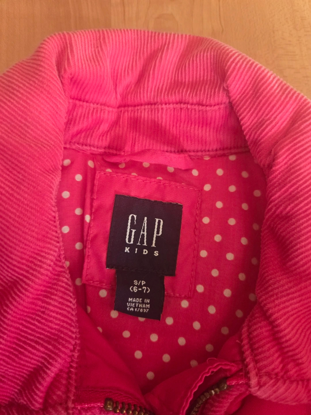 Gap Kids quilted jacket in a bright pink colour. It features a corduroy collar and cuffs. The inner lining has a white polka dot pattern. This jacket is size S/P, suitable for ages 6-7.