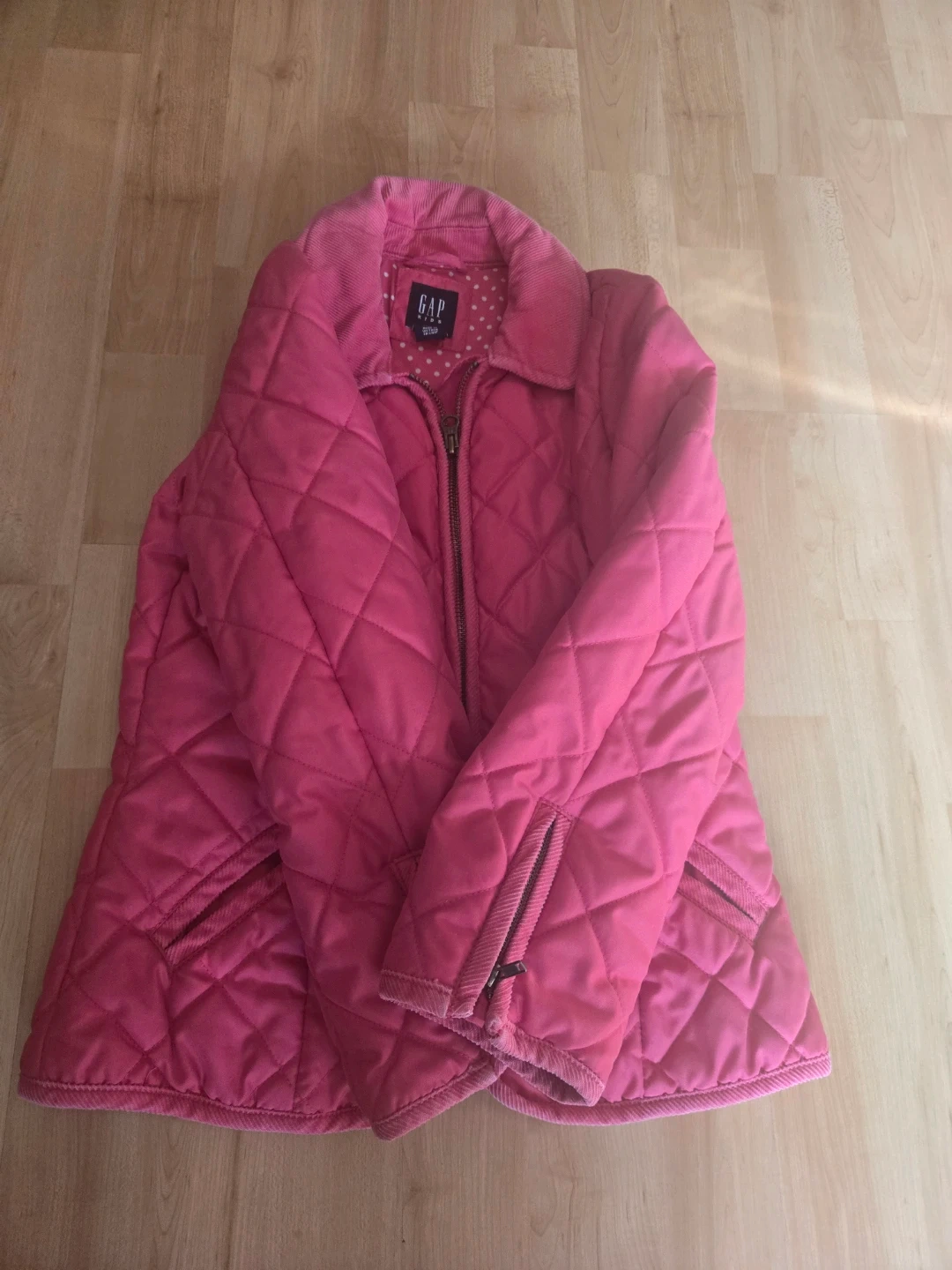 Gap Kids quilted jacket in a bright pink colour. It features a corduroy collar and cuffs. The inner lining has a white polka dot pattern. This jacket is size S/P, suitable for ages 6-7.