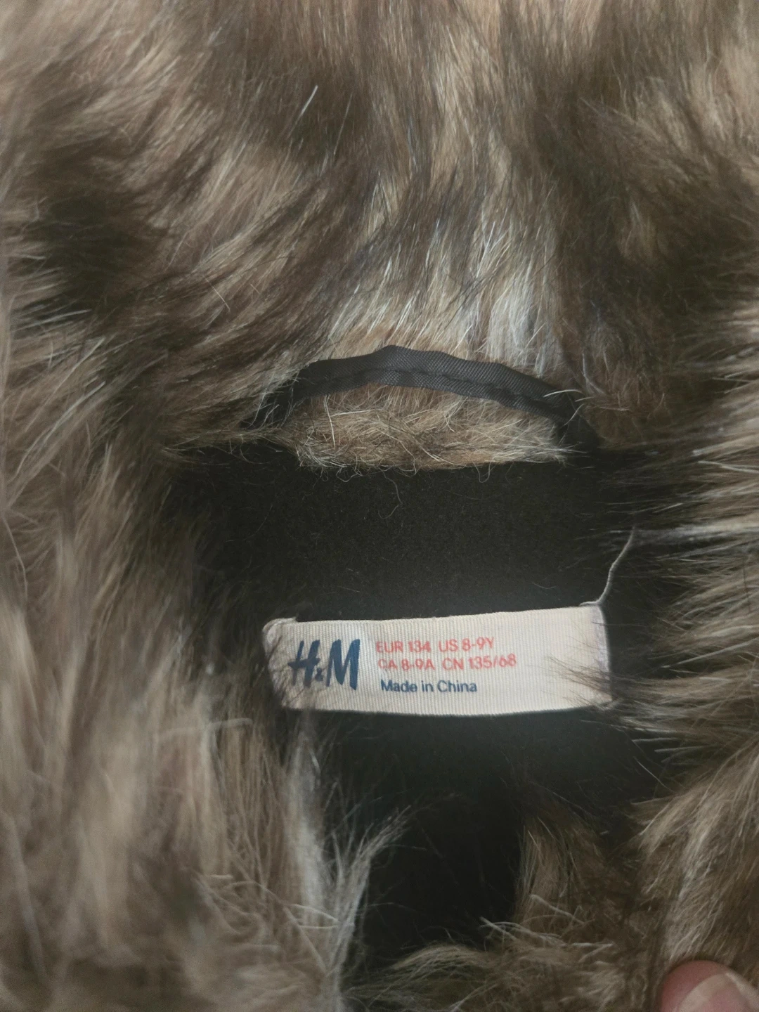 This H&M peacoat is black with faux fur trim on the collar and cuffs. It's a double-breasted style with buttons. The size is EUR 134, US 8-9Y. Perfect for keeping warm on chilly days!