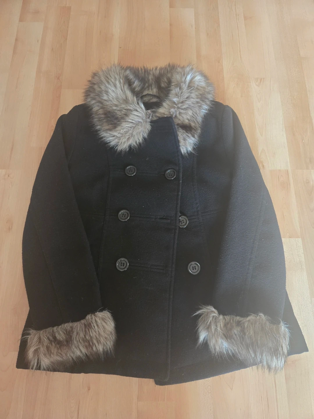 This H&M peacoat is black with faux fur trim on the collar and cuffs. It's a double-breasted style with buttons. The size is EUR 134, US 8-9Y. Perfect for keeping warm on chilly days!