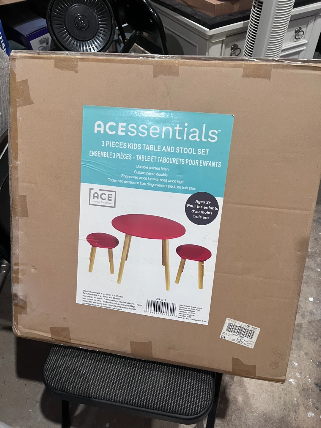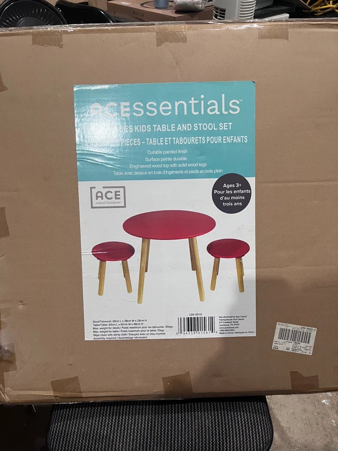 This ACESSentials set includes one table and two stools for children. It features a durable painted finish and engineered wood top with solid wood legs. Suitable for ages 3 and up.