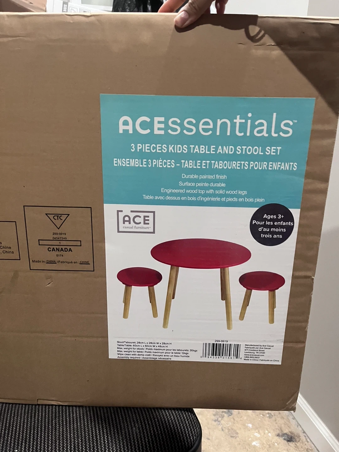 This ACESSentials set includes one table and two stools for children. It features a durable painted finish and engineered wood top with solid wood legs. Suitable for ages 3 and up.