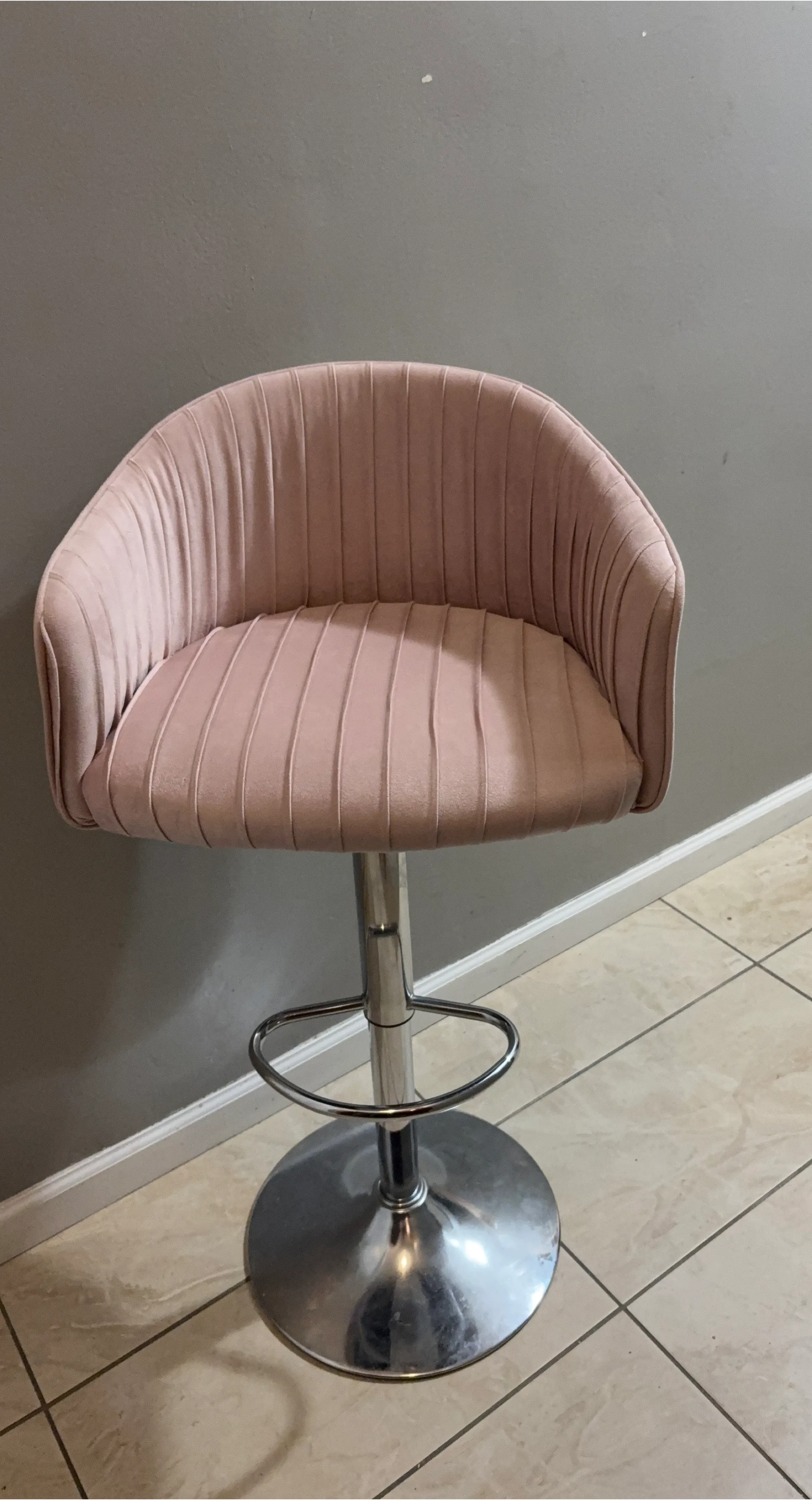 This bar stool features a plush pink velvet upholstery with a channeled design. It has a chrome base with a footrest and adjustable height. Its sleek design makes it a stylish addition to any kitchen or bar area!
