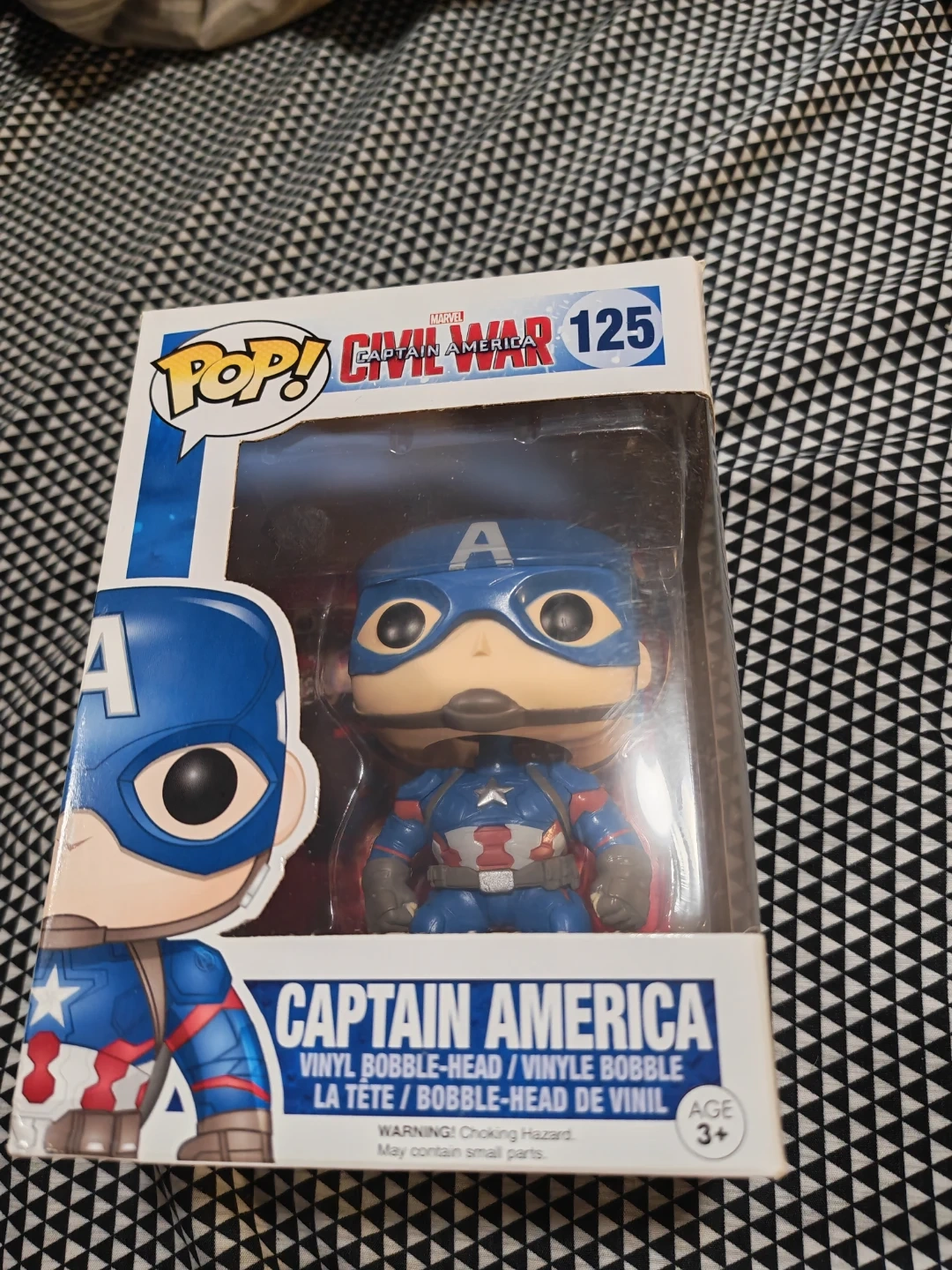 This is a Funko Pop! Vinyl Bobble-Head figure of Captain America from the Marvel Civil War collection, number 125. It's recommended for ages 3 and up. The figure comes in its original packaging.