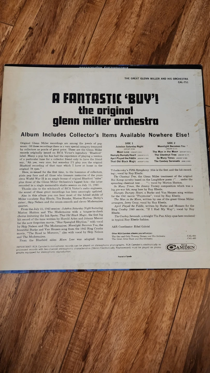This RCA Camden record features original Glenn Miller Orchestra recordings. Includes collector's items and songs like Moonlight Serenade and Tuxedo Junction. A fantastic selection for any swing music fan!