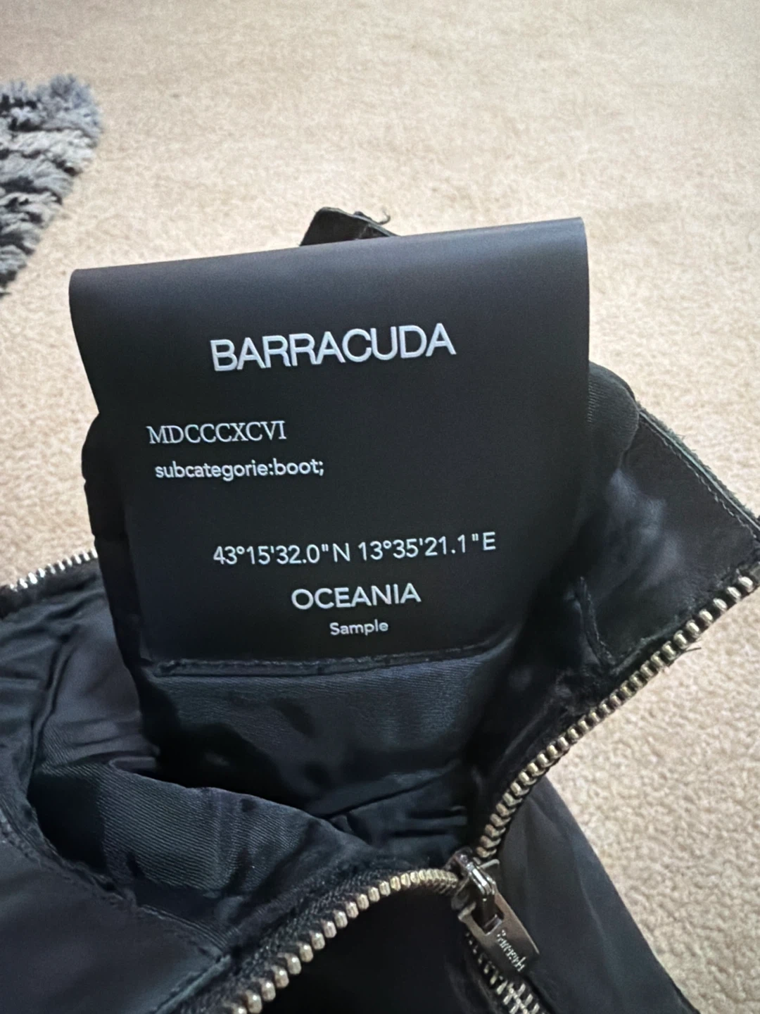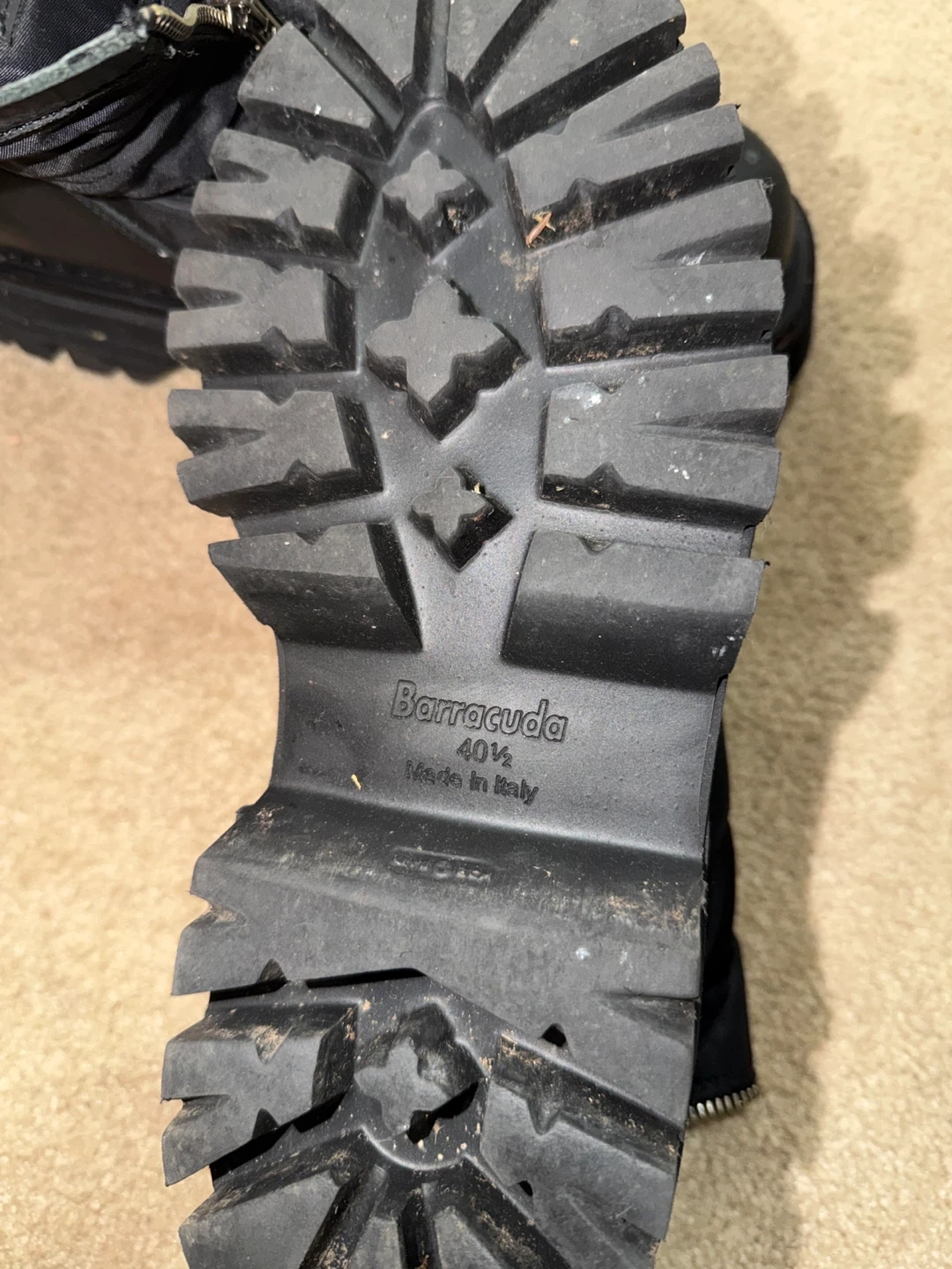 Barracuda black zip boots. These boots are size 40.5 and made in Italy. They feature a front zipper closure and a rugged sole. Perfect for any urban explorer!