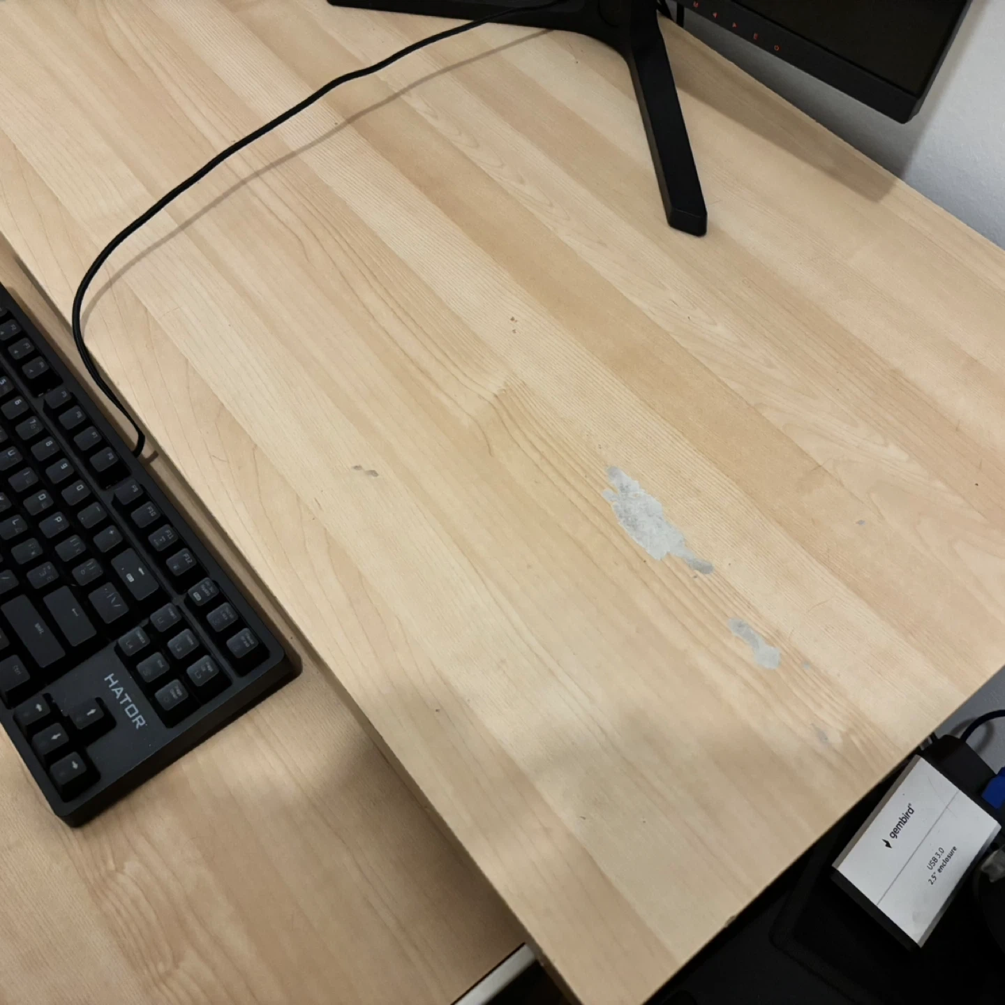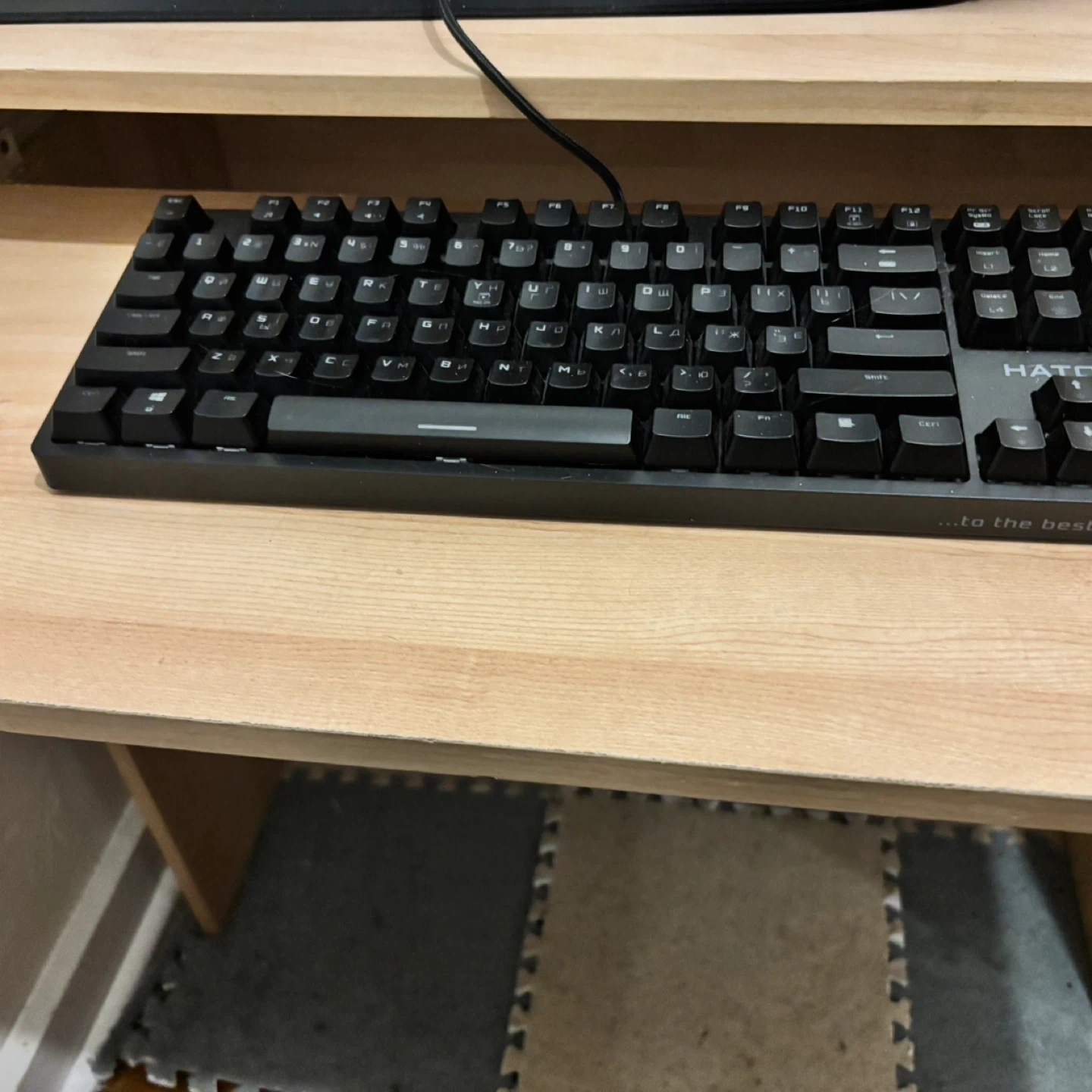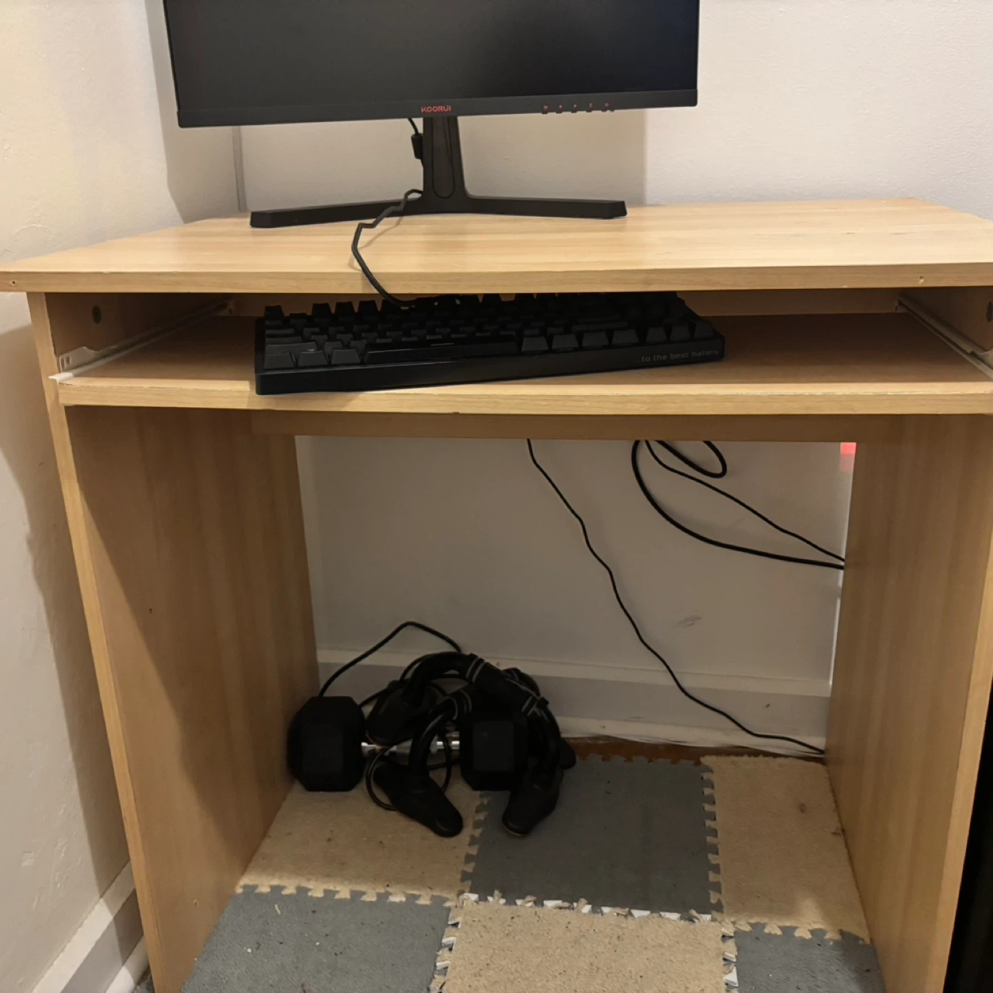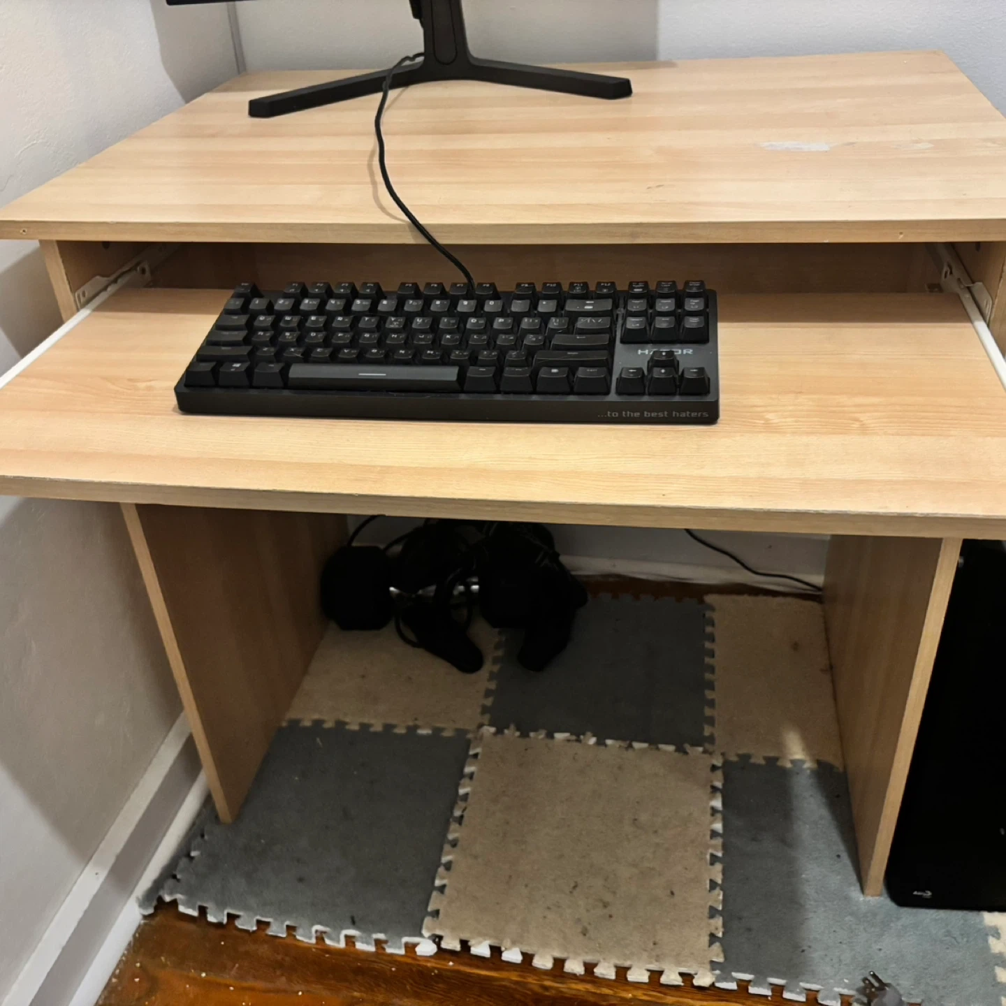 This computer desk features a light wood finish and a pull-out keyboard tray. It has ample space underneath for storage or a PC tower. The desk surface shows some minor wear.
