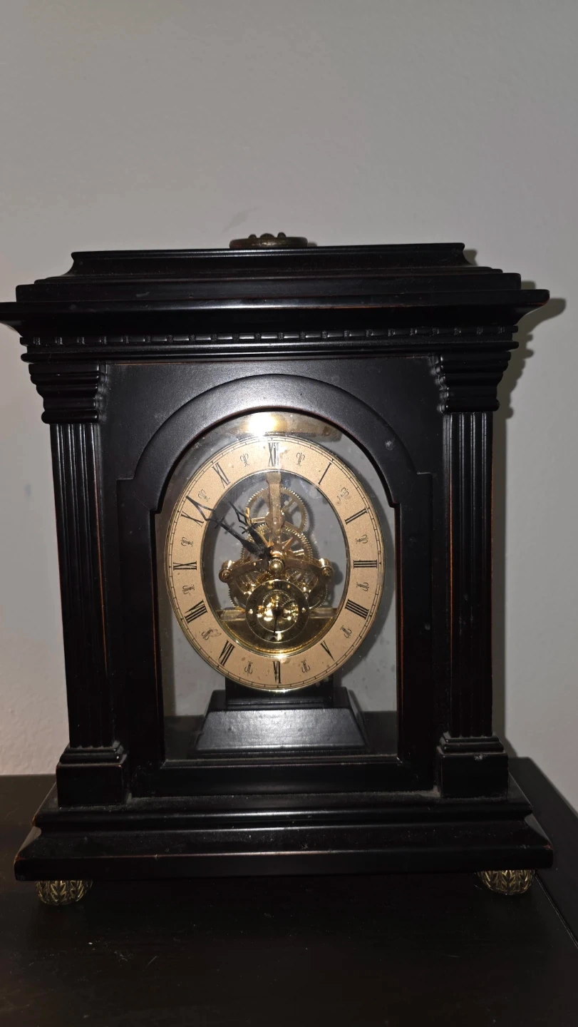 This Bombay mantel clock features a visible brass movement and a black wood case. It's a decorative piece for any shelf or mantle. A great accent for a living room or study!