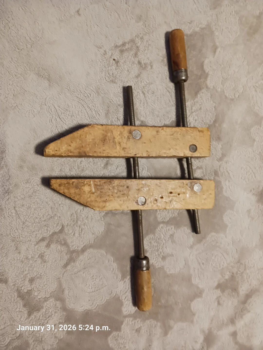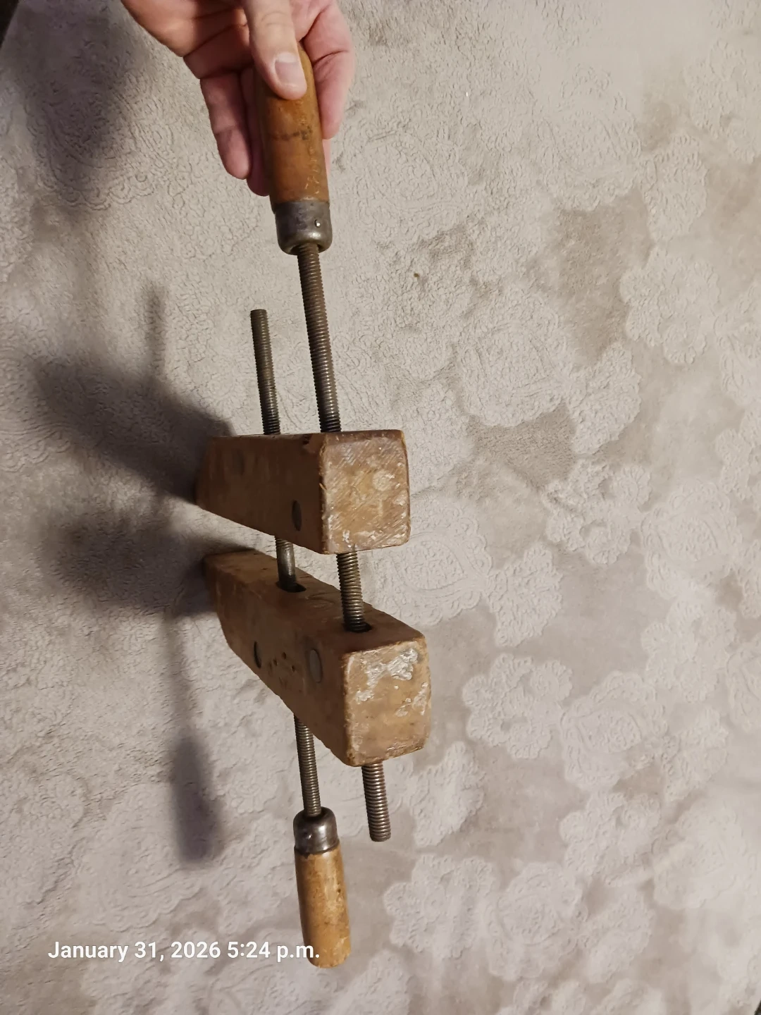 This is a vintage woodworking clamp with wooden jaws and handles. It's adjustable with metal screws. This clamp is useful for woodworking projects.