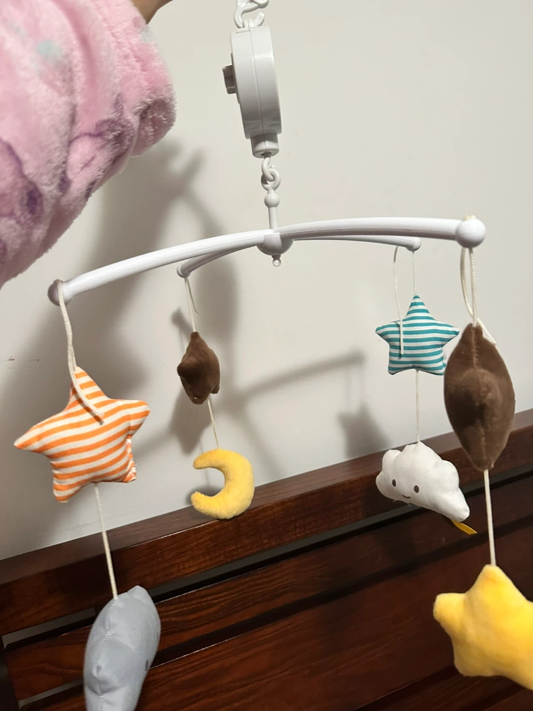 This plush baby crib mobile features colourful stuffed shapes including stars, a moon, and clouds. It's designed to attach to a crib. It's perfect for a nursery.
