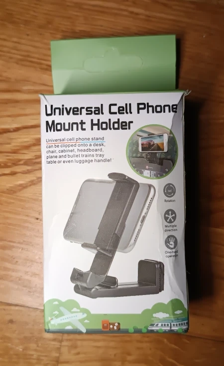This is a universal cell phone mount holder that can be clipped onto various surfaces. It offers 360-degree rotation and one-hand operation. It's useful for keeping your phone accessible while on the go or at a desk.