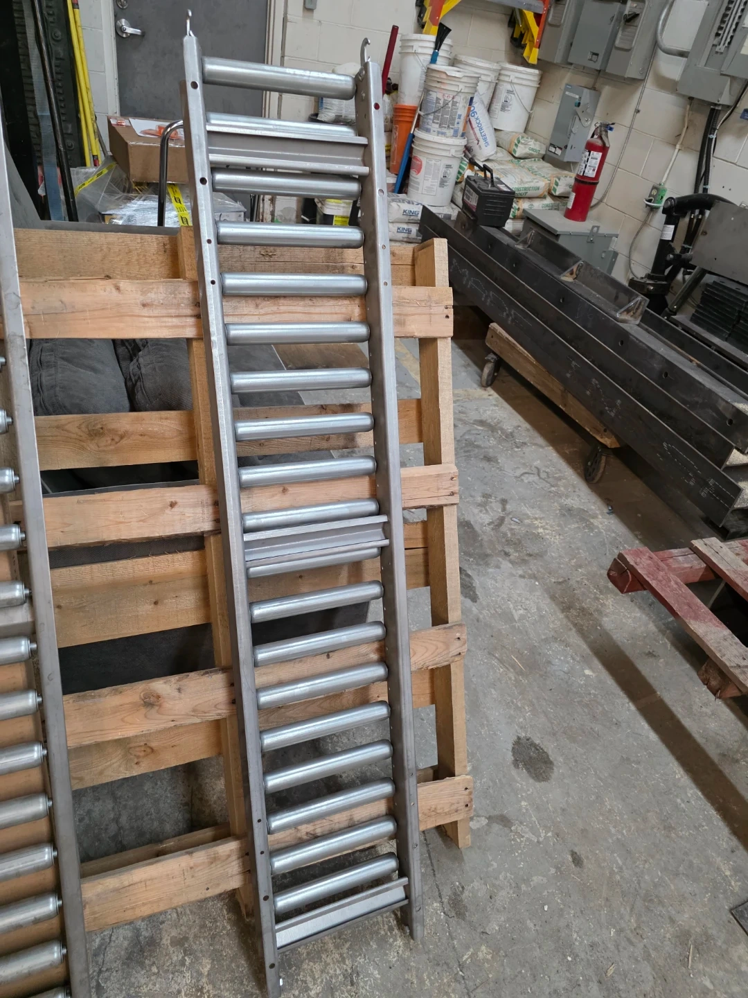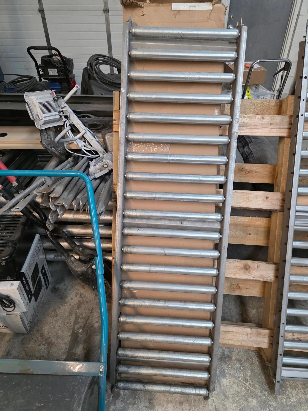 Selling two roller conveyor sections. Each section features durable metal rollers. These are great for moving boxes or other items in a warehouse or workshop setting. Sections are approximately 2 metres long.