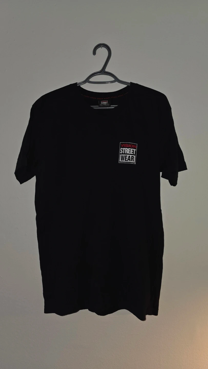 This is a black Vision Street Wear t-shirt. It's a size medium with the brand's logo printed on the front and back. Made from cotton material.