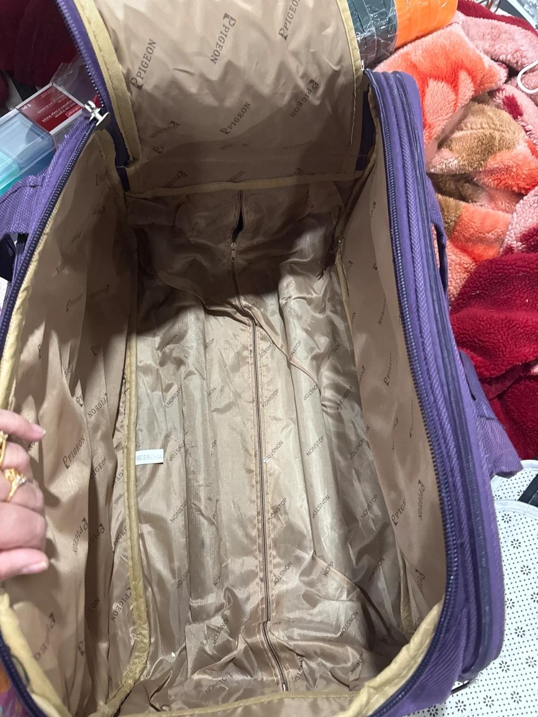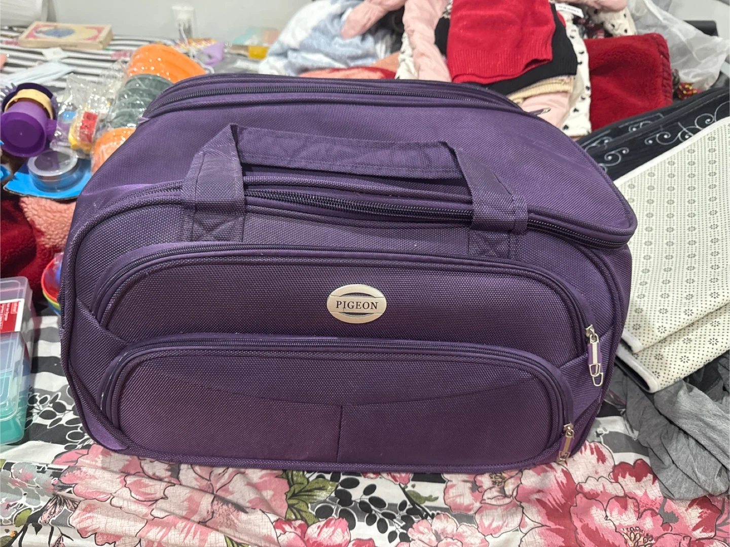 This is a Pigeon brand rolling luggage bag in a vibrant purple colour. It features a telescopic handle and wheels for easy transport. The interior lining is also branded Pigeon.