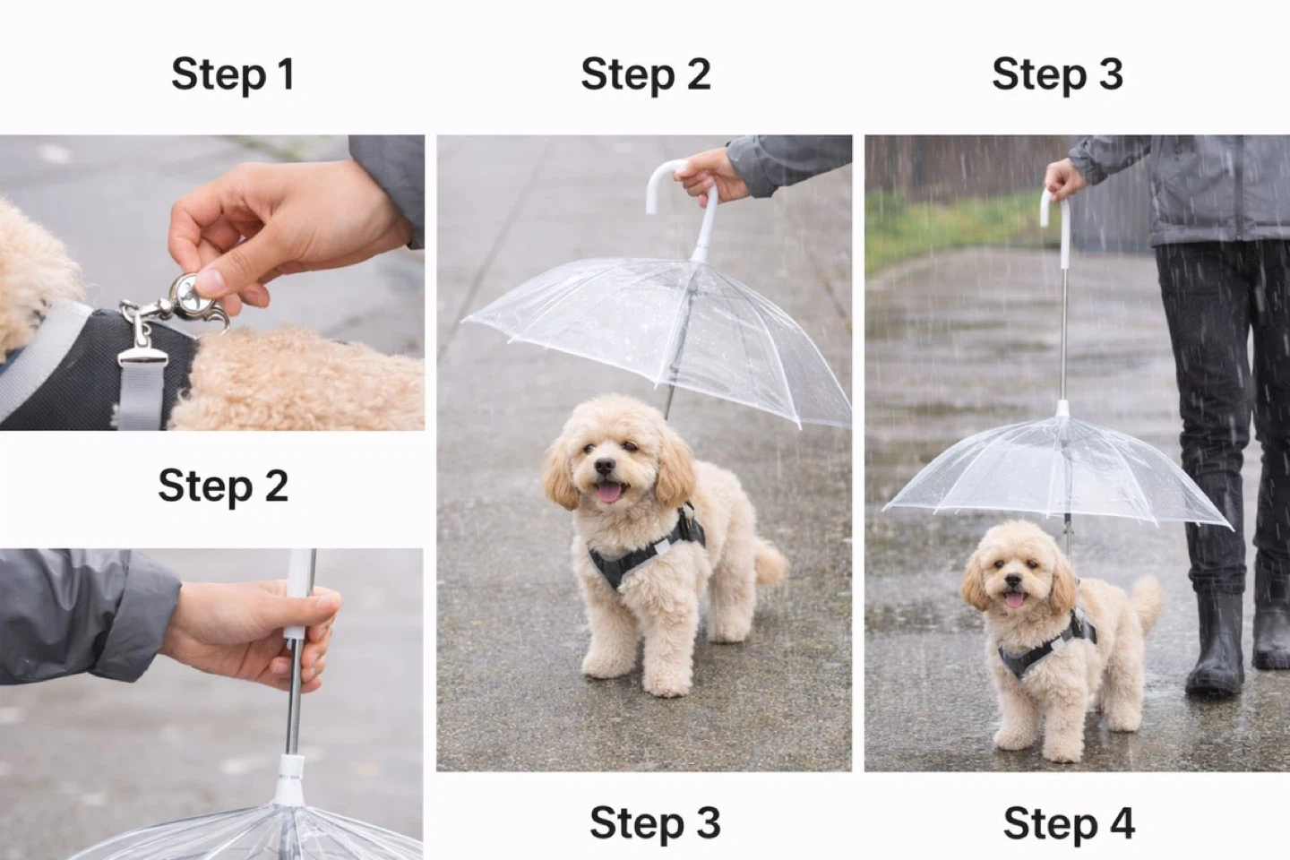 Keep your furry friend dry with this handy clear dome umbrella. It features a convenient leash clip and a sturdy metal shaft. Ideal for walks in the rain!