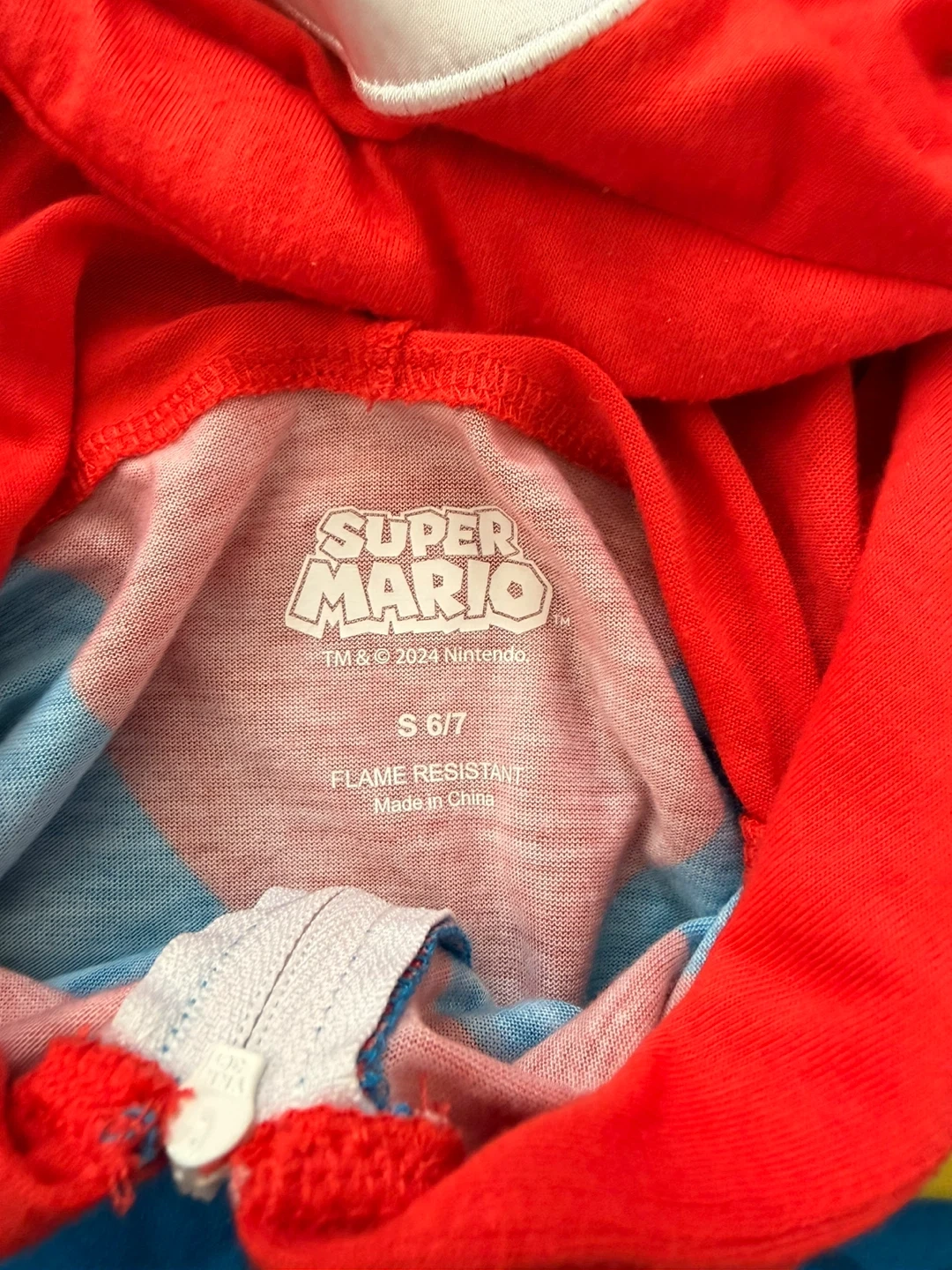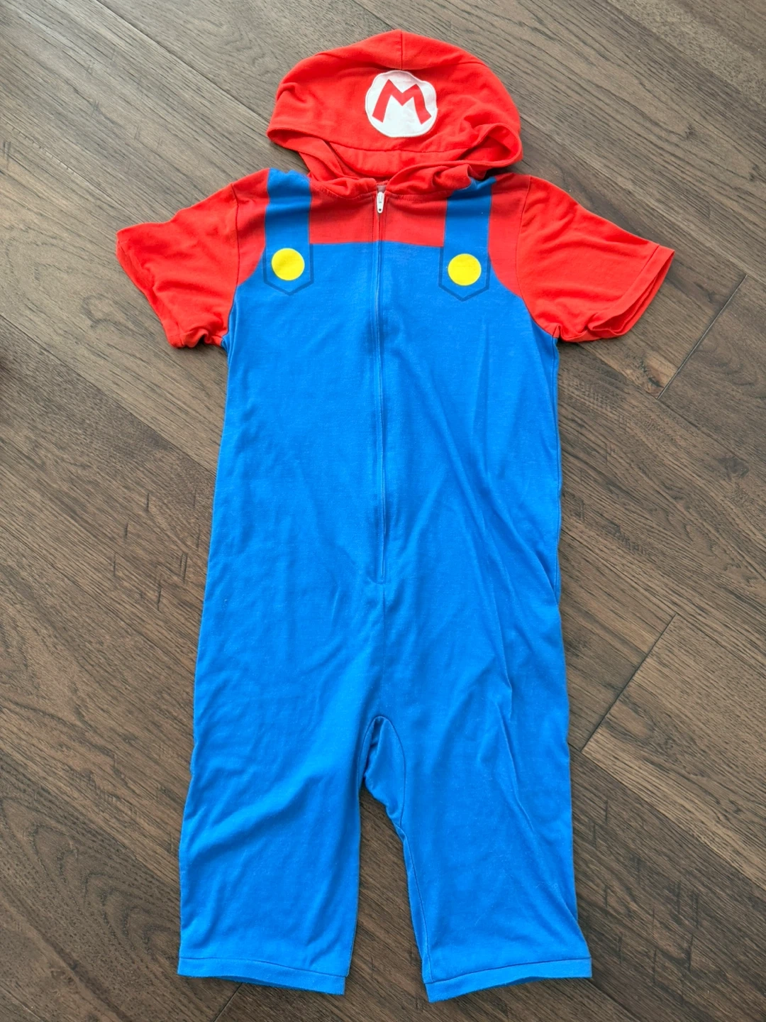 A Super Mario onsie with a super cute hood. Soft, comfortable fabric and really cute on - S 6/7.