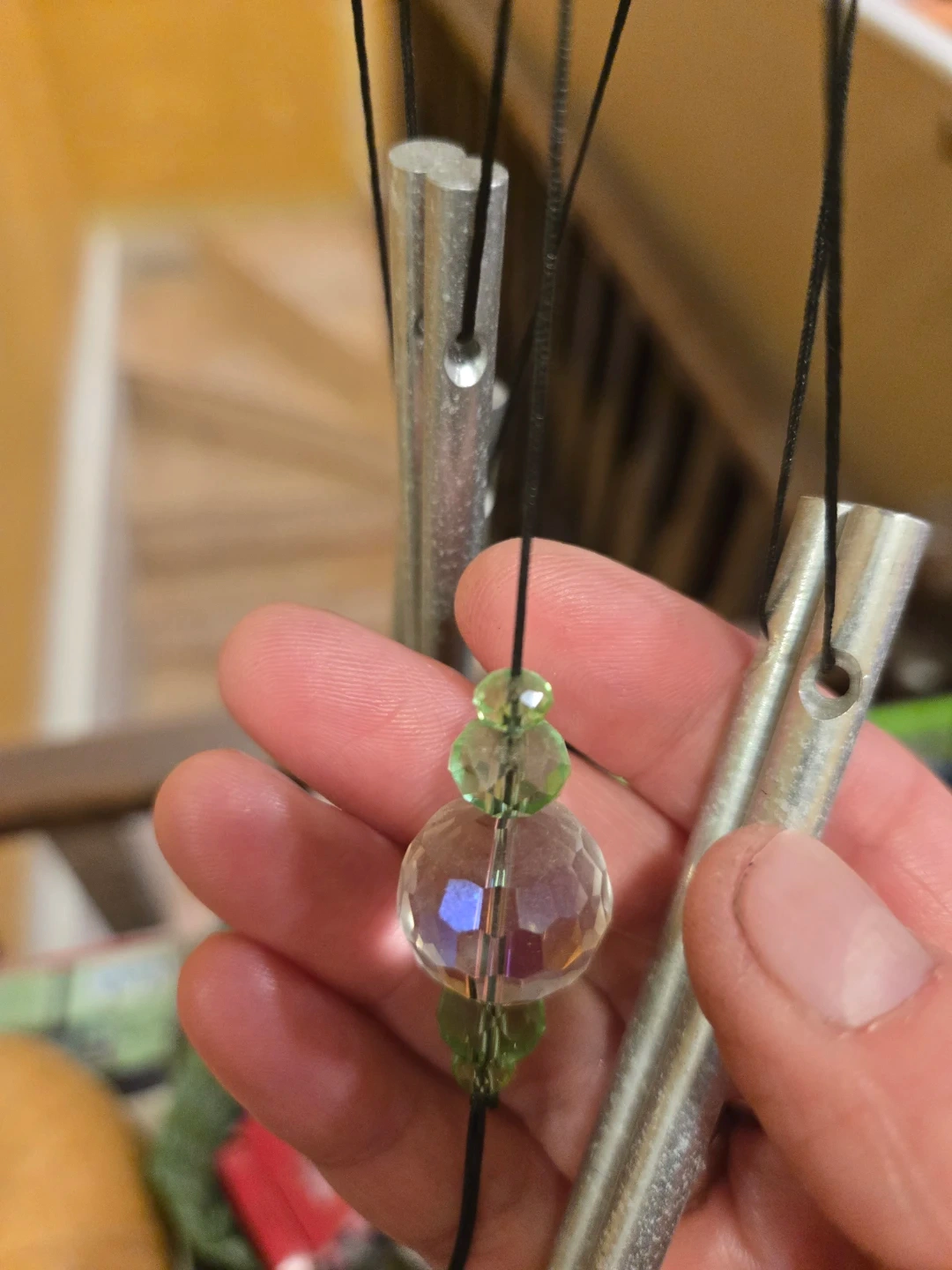 Beautiful metal wind chime featuring silver-toned tubes and a decorative tree of life accent. It has a large green glass crystal at the bottom for added charm. This chime would liven up any outdoor space!