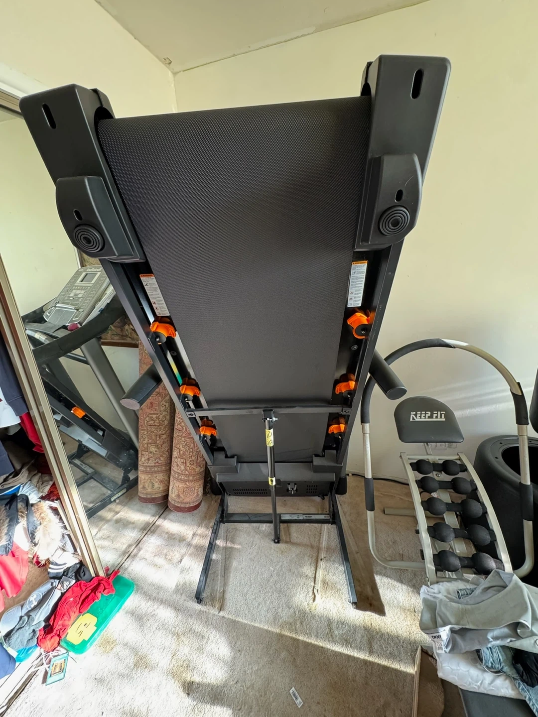 NordicTrack treadmill for your home gym. This unit is black and grey with a digital display for tracking your workouts. It's in good used condition and ready for a new home