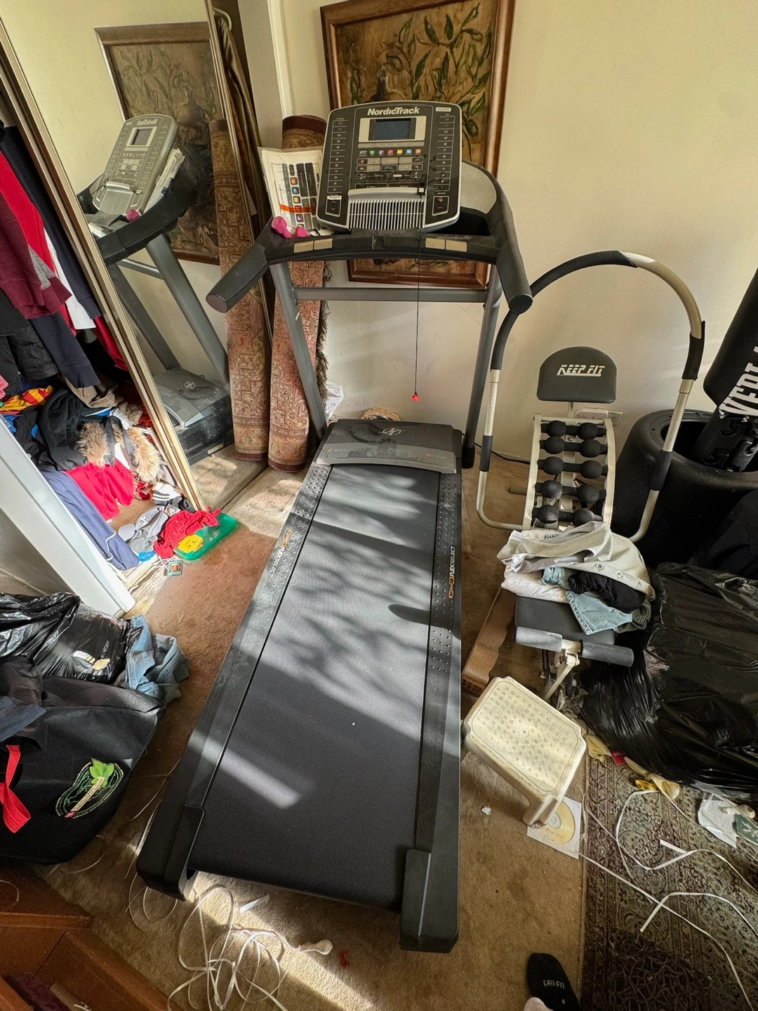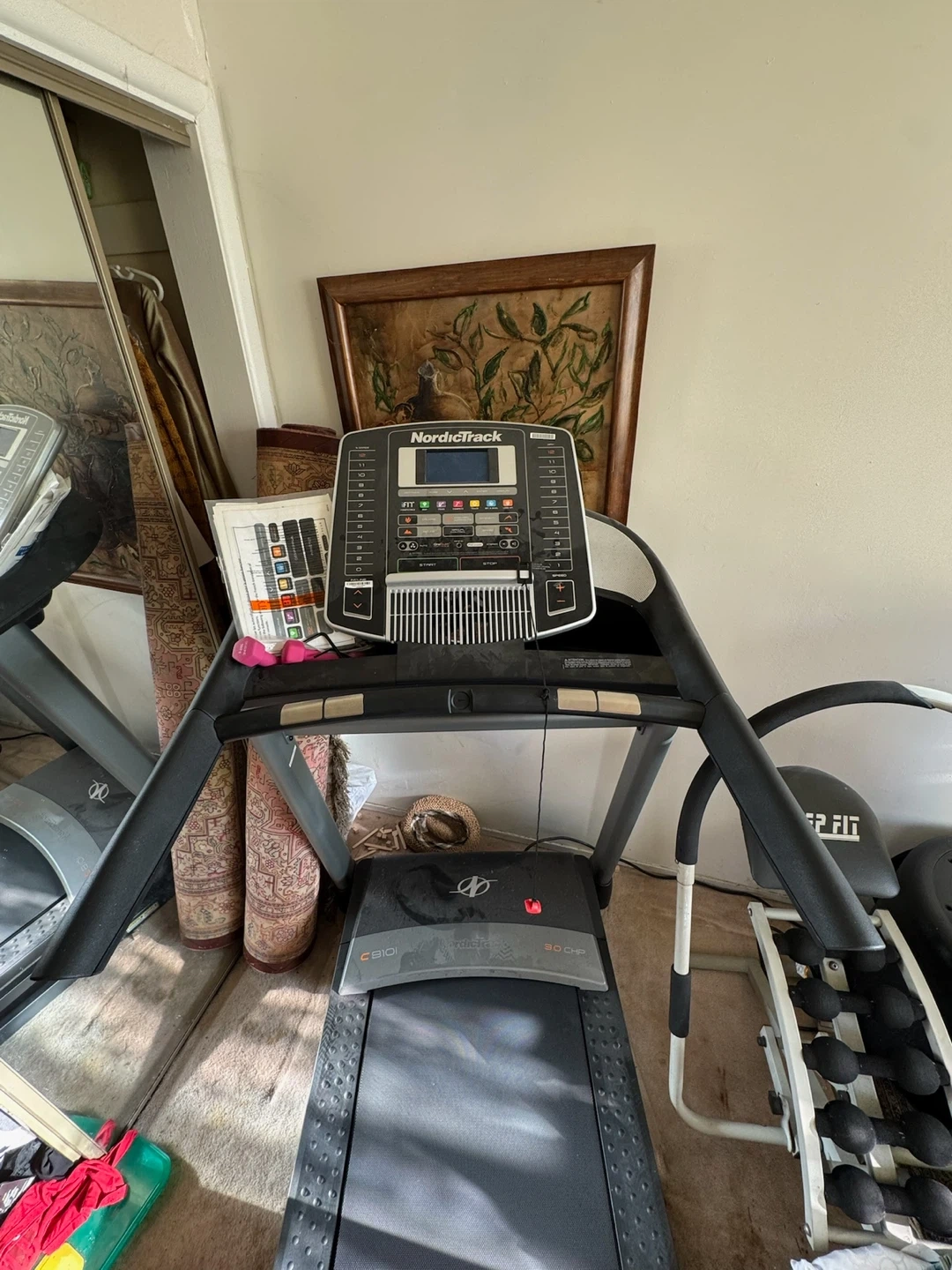 NordicTrack treadmill for your home gym. This unit is black and grey with a digital display for tracking your workouts. It's in good used condition and ready for a new home