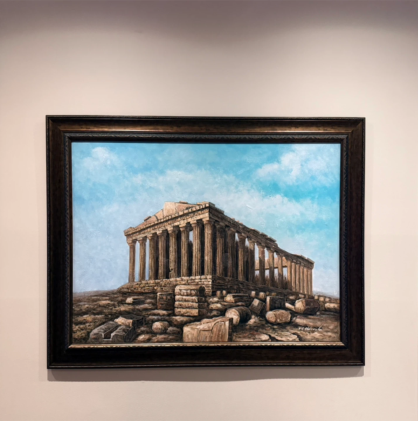 This is a framed painting depicting the ancient Parthenon. The artwork is signed by the artist. It features a beautiful rendition of the iconic Greek structure against a bright blue sky.