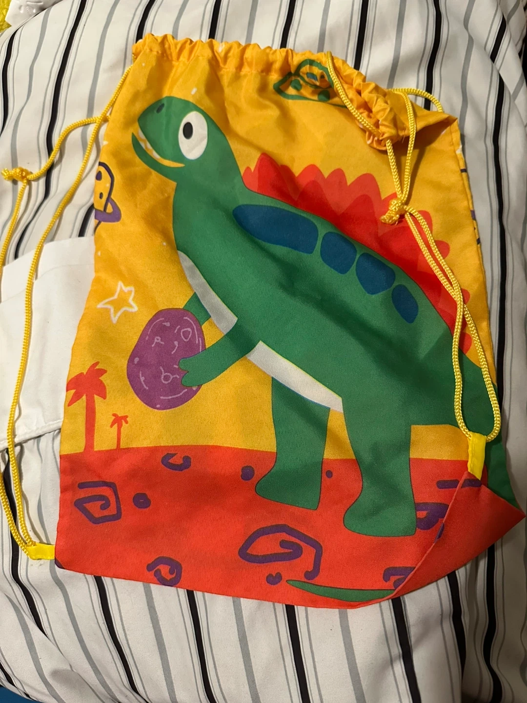 This bright yellow drawstring bag features a fun green dinosaur graphic with a purple egg. It has a colourful background with palm trees and abstract shapes. The bag is made of fabric and has yellow drawstrings for closure.