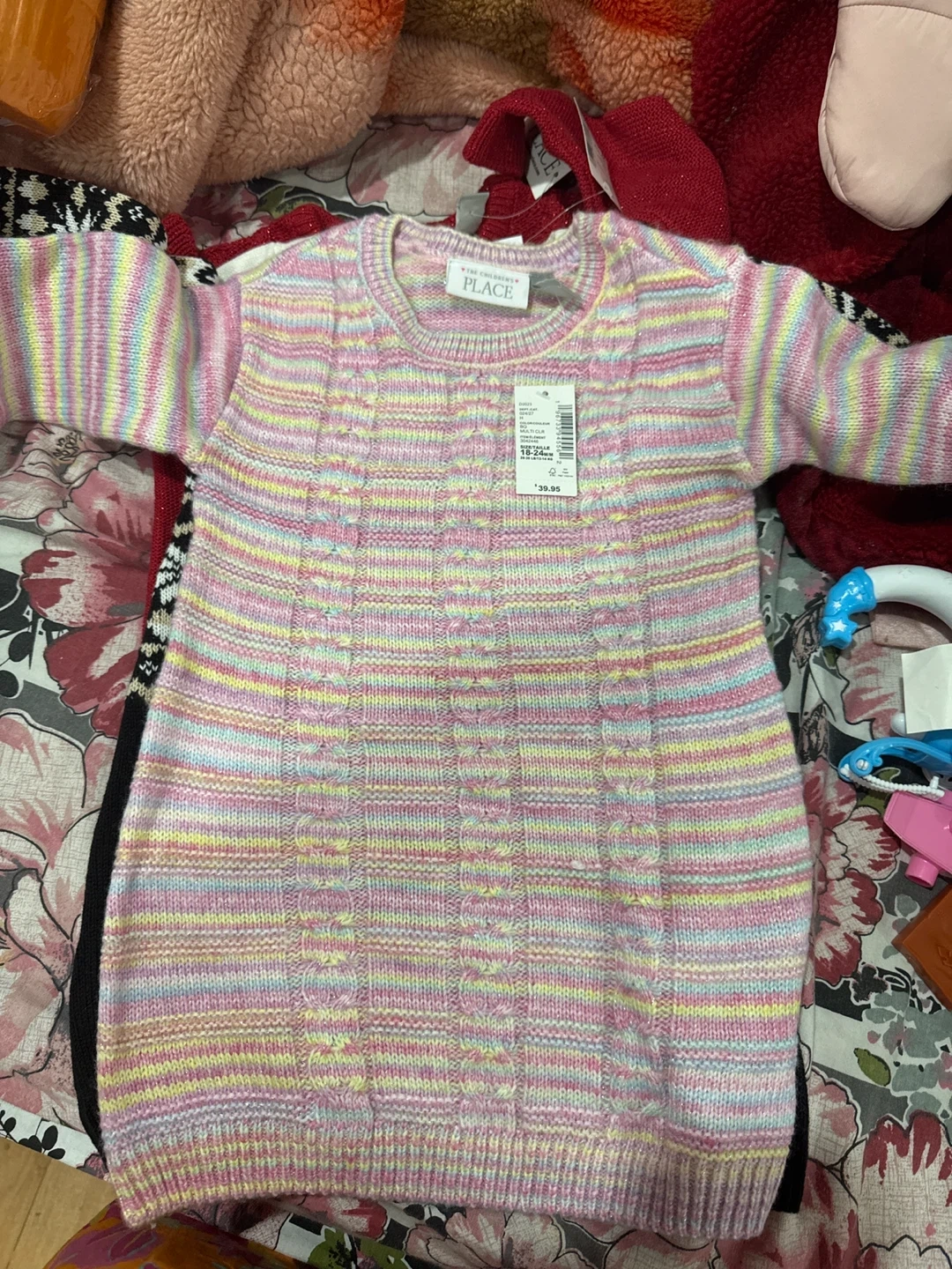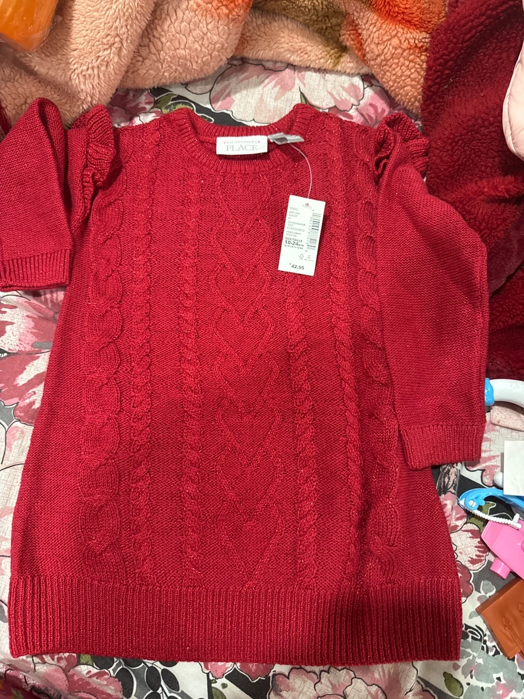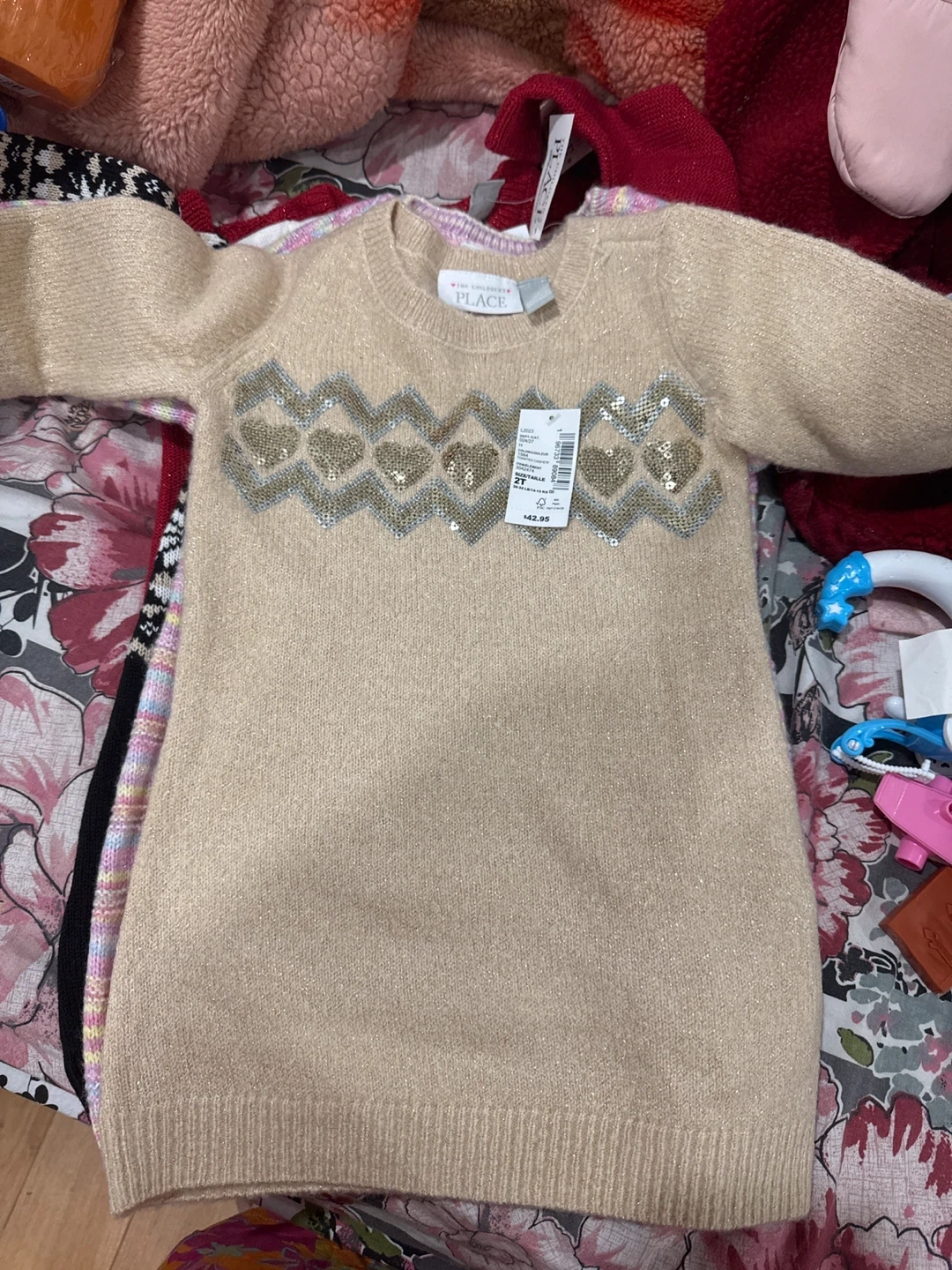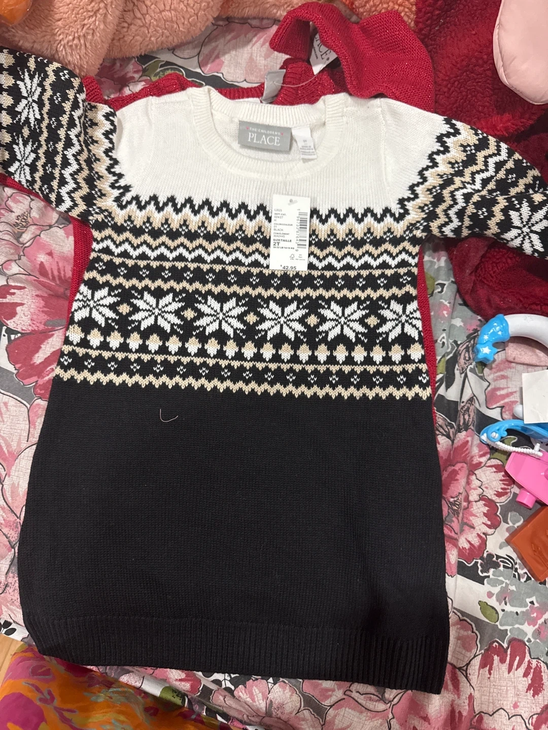 Four girls' sweaters from The Children's Place. Includes a beige sweater with heart sequins, a black, white, and tan Fair Isle patterned sweater, and a red cable knit sweater. Machine washable.