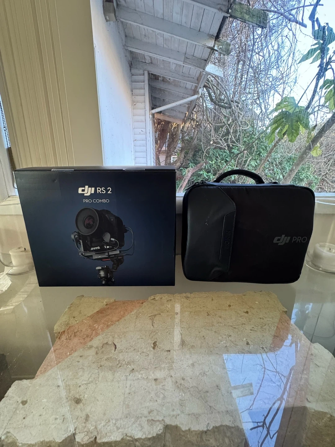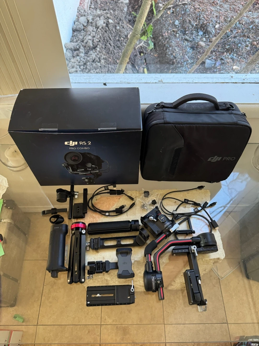 DJI RS 2 Pro Combo gimbal stabilizer. It includes the gimbal, a carrying case, and various accessories for camera stabilization. In excellent condition, only used a handful of times!!