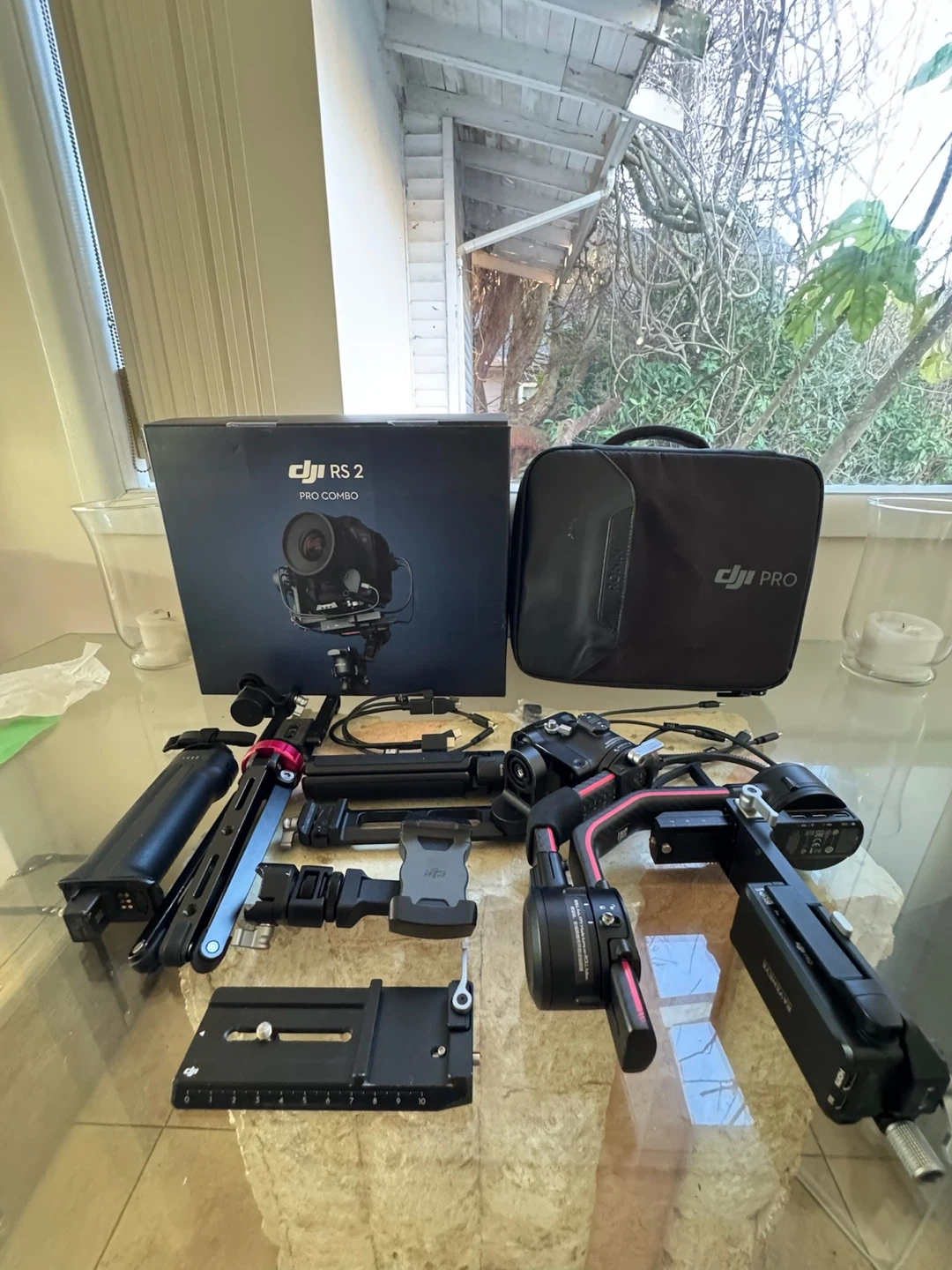 DJI RS 2 Pro Combo gimbal stabilizer. It includes the gimbal, a carrying case, and various accessories for camera stabilization. In excellent condition, only used a handful of times!!