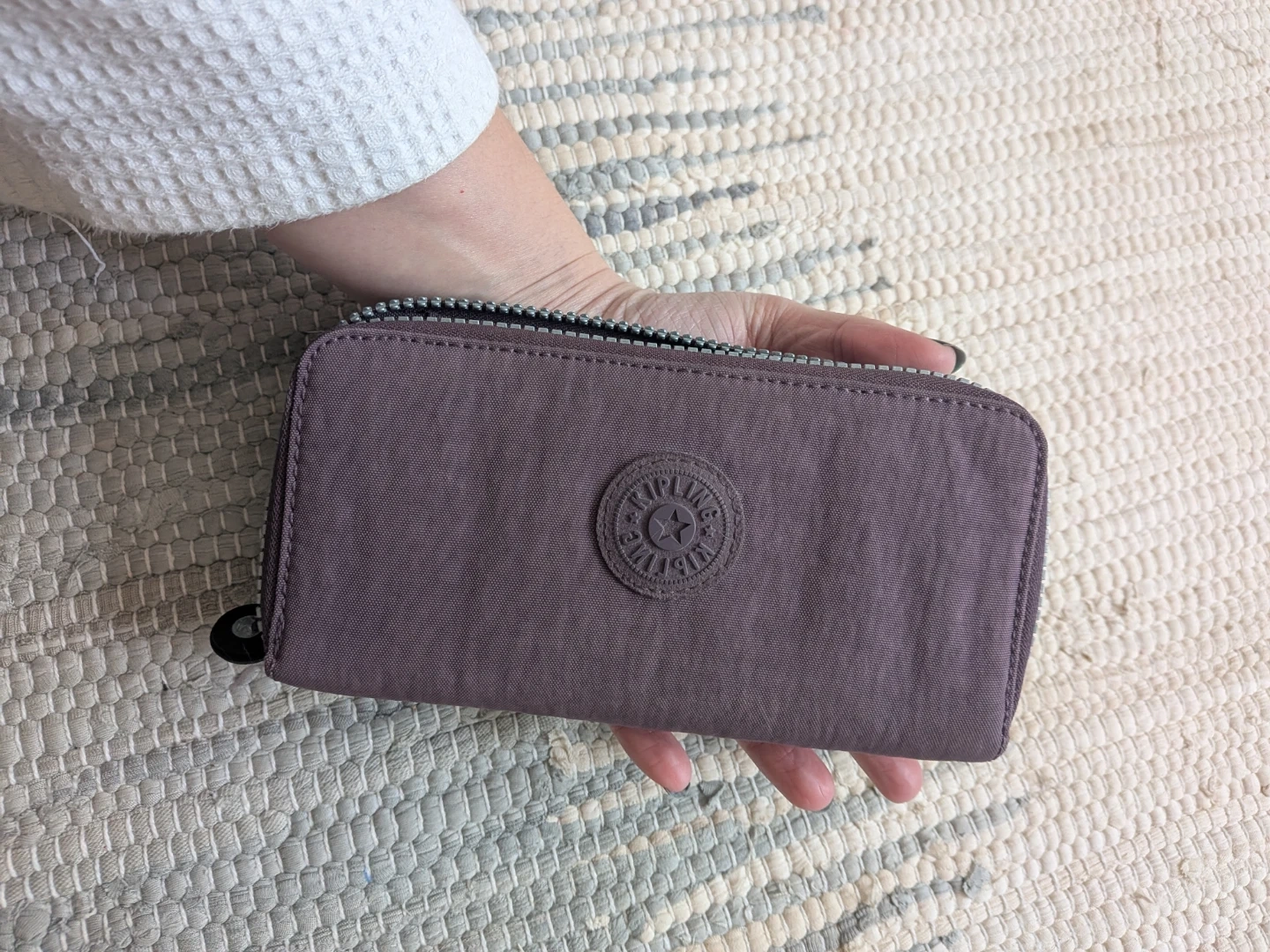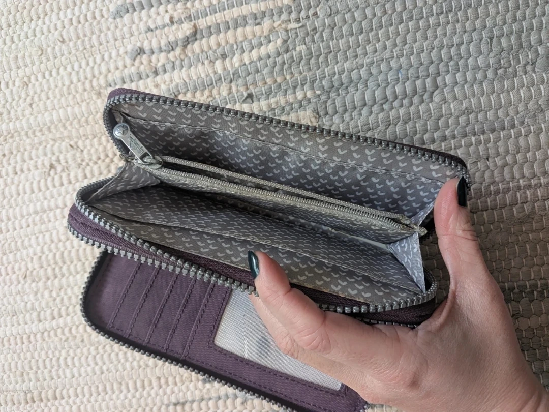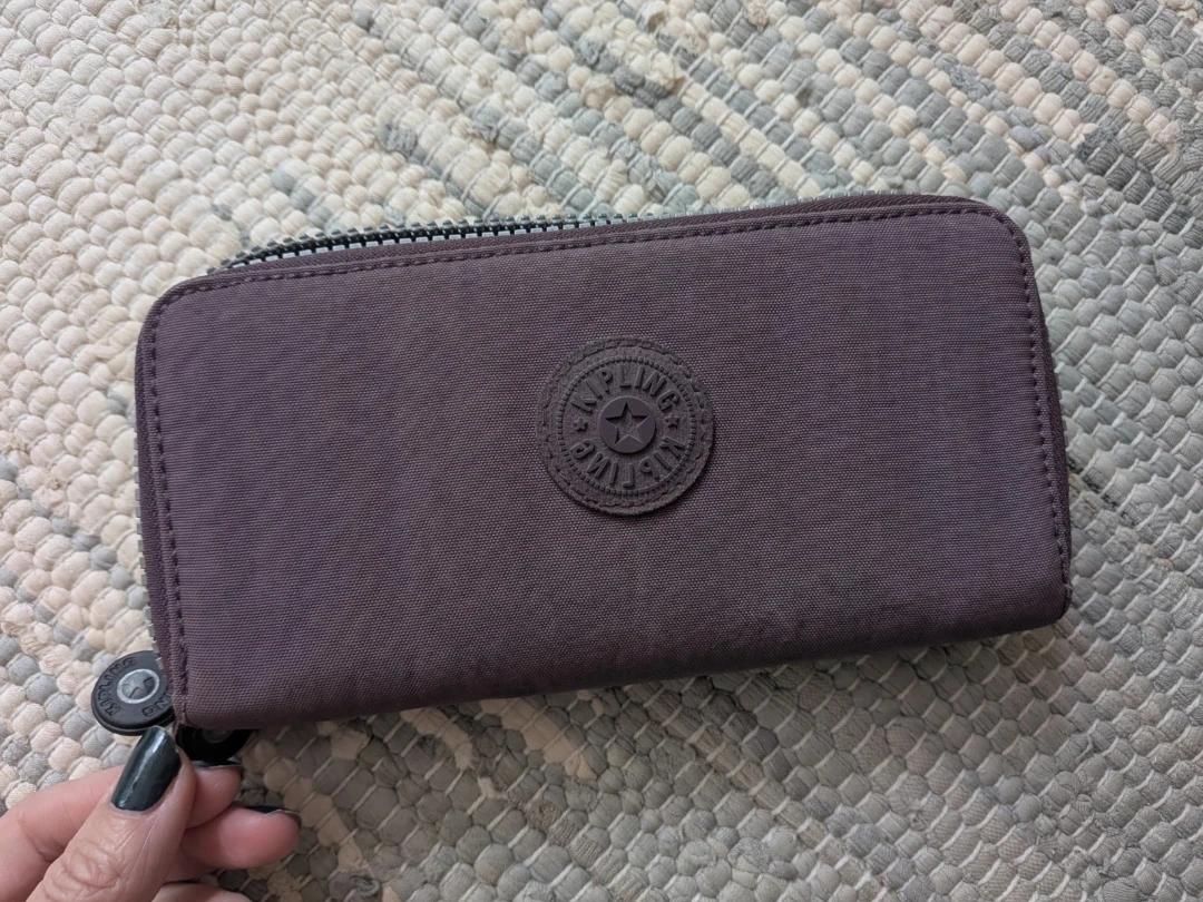 This is a Kipling zip-around wallet in a lovely shade of purple. It features multiple card slots, a clear ID window, and a zippered coin pocket inside. The durable nylon construction ensures it's built to last!