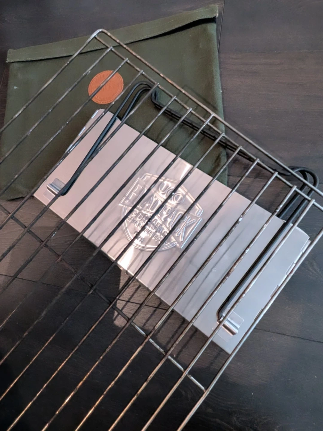 This UCO Flatpack portable grill folds down for easy transport. It's made of stainless steel and comes with a green canvas carrying case and a leather patch. The grill includes a grilling rack.