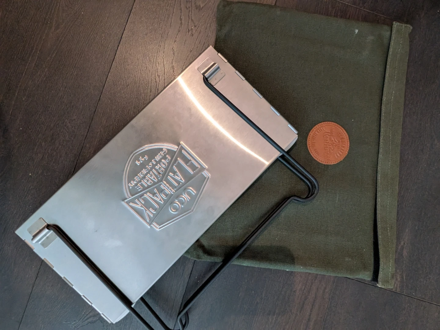 This UCO Flatpack portable grill folds down for easy transport. It's made of stainless steel and comes with a green canvas carrying case and a leather patch. The grill includes a grilling rack.
