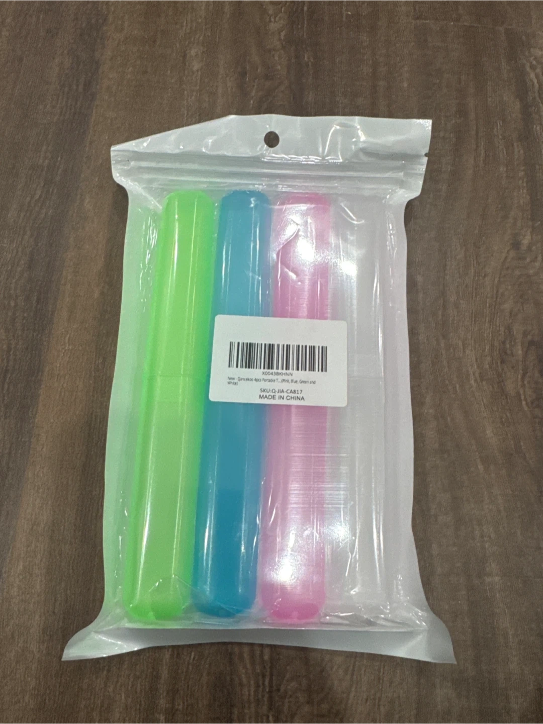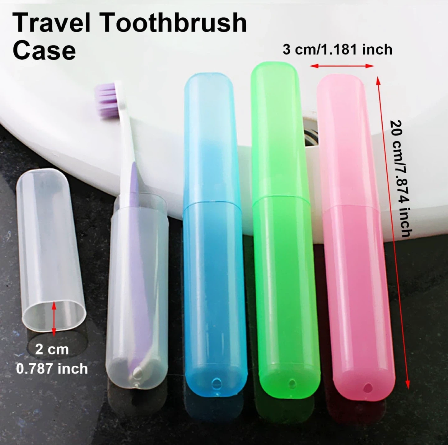 Pack of four travel toothbrush cases. One blue, one green, clear and one pink. Each case is 20 cm tall and 3 cm wide. Protects your toothbrush on the go!