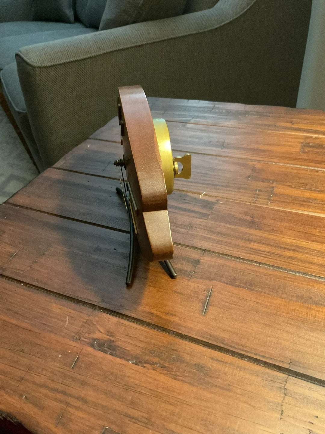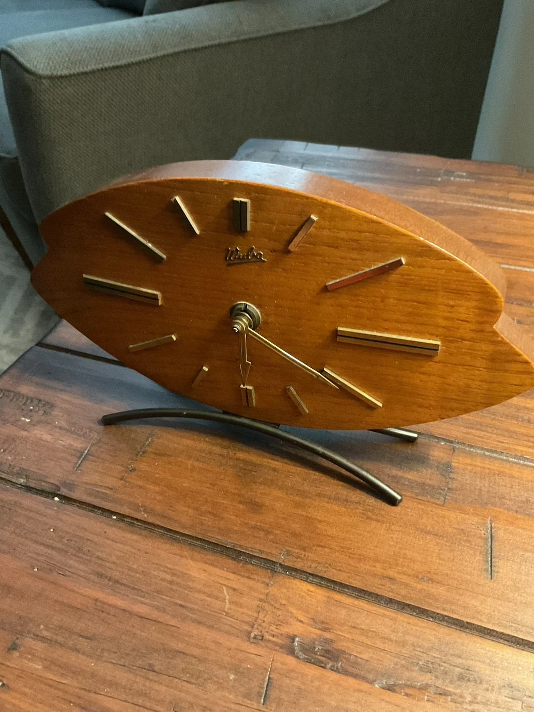 This clock features a wooden body with a distinctive shape. It has gold-tone hour markers and hands. The clock is mounted on a metal stand. It uses a wind-up mechanism. The clock is in good working order.
