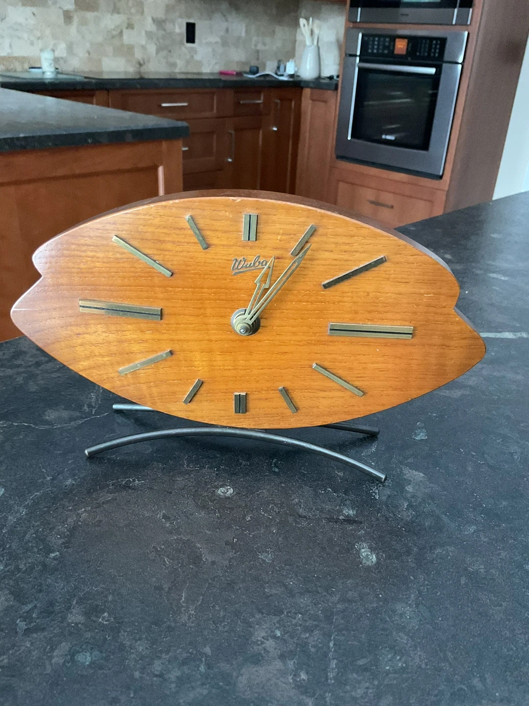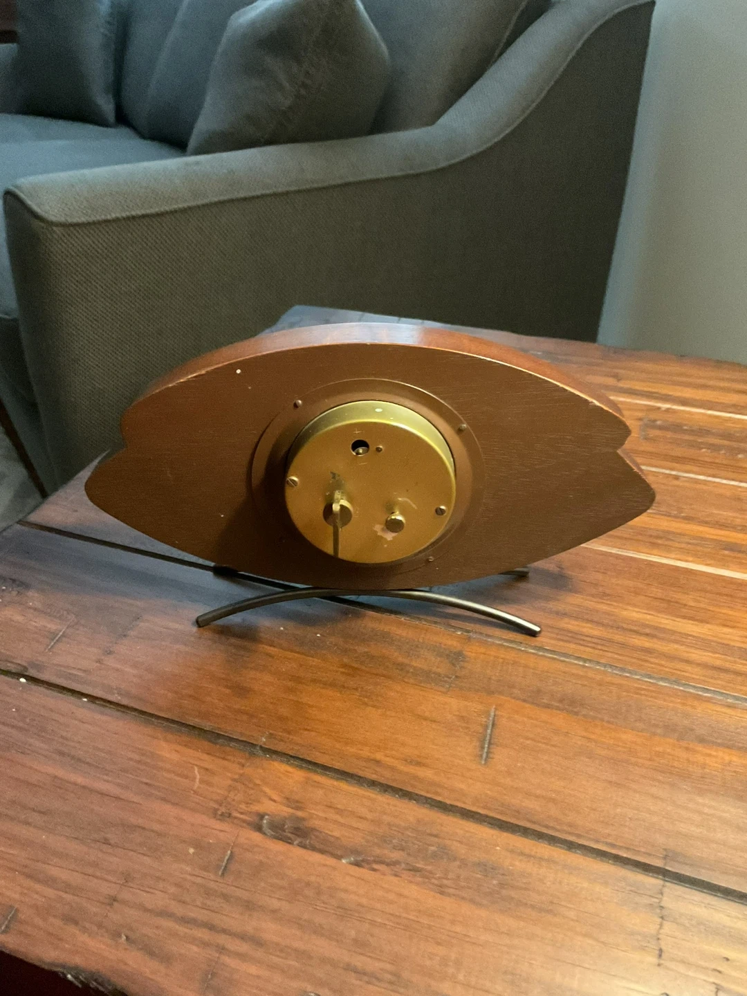 This clock features a wooden body with a distinctive shape. It has gold-tone hour markers and hands. The clock is mounted on a metal stand. It uses a wind-up mechanism. The clock is in good working order.