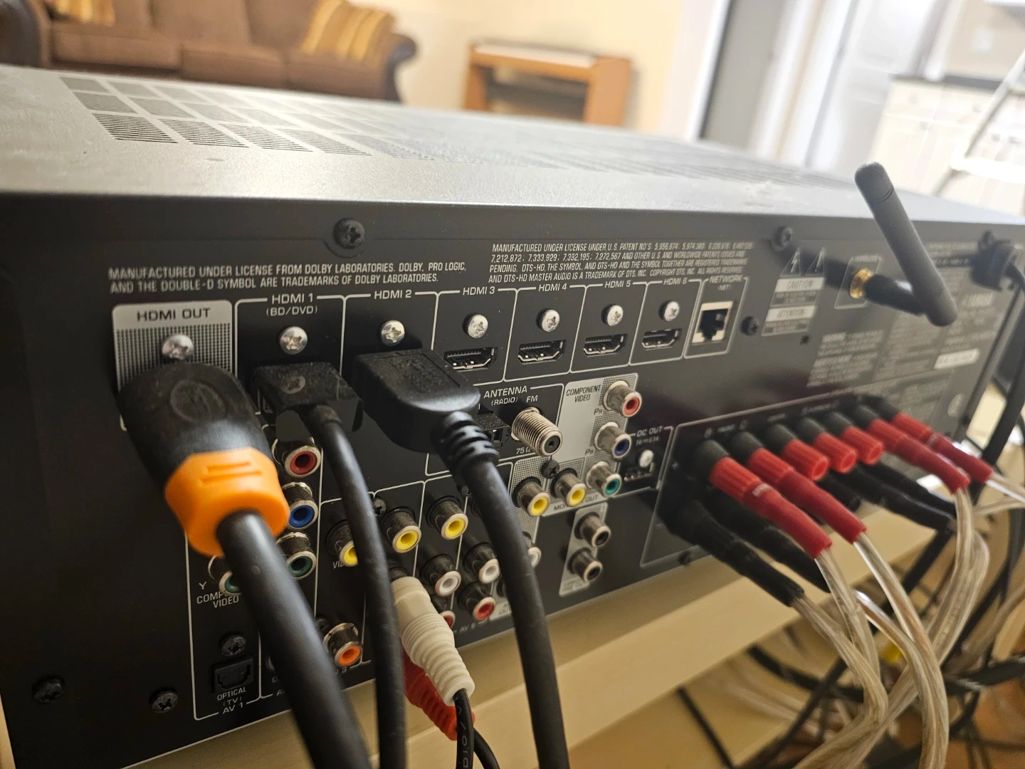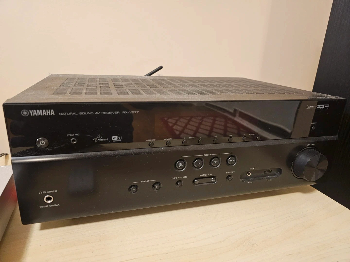 Yamaha Natural Sound AV Receiver RX-V577. It's a black 7.2 channel receiver. Supports Wi-Fi and Dolby Pro Logic. Many HDMI inputs available.