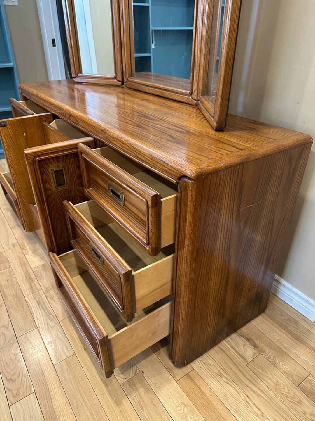 Solid vintage oak dresser with folding triple mirror. Very sturdy and functional with smooth drawers and lots of storage. Classic 1970s style.