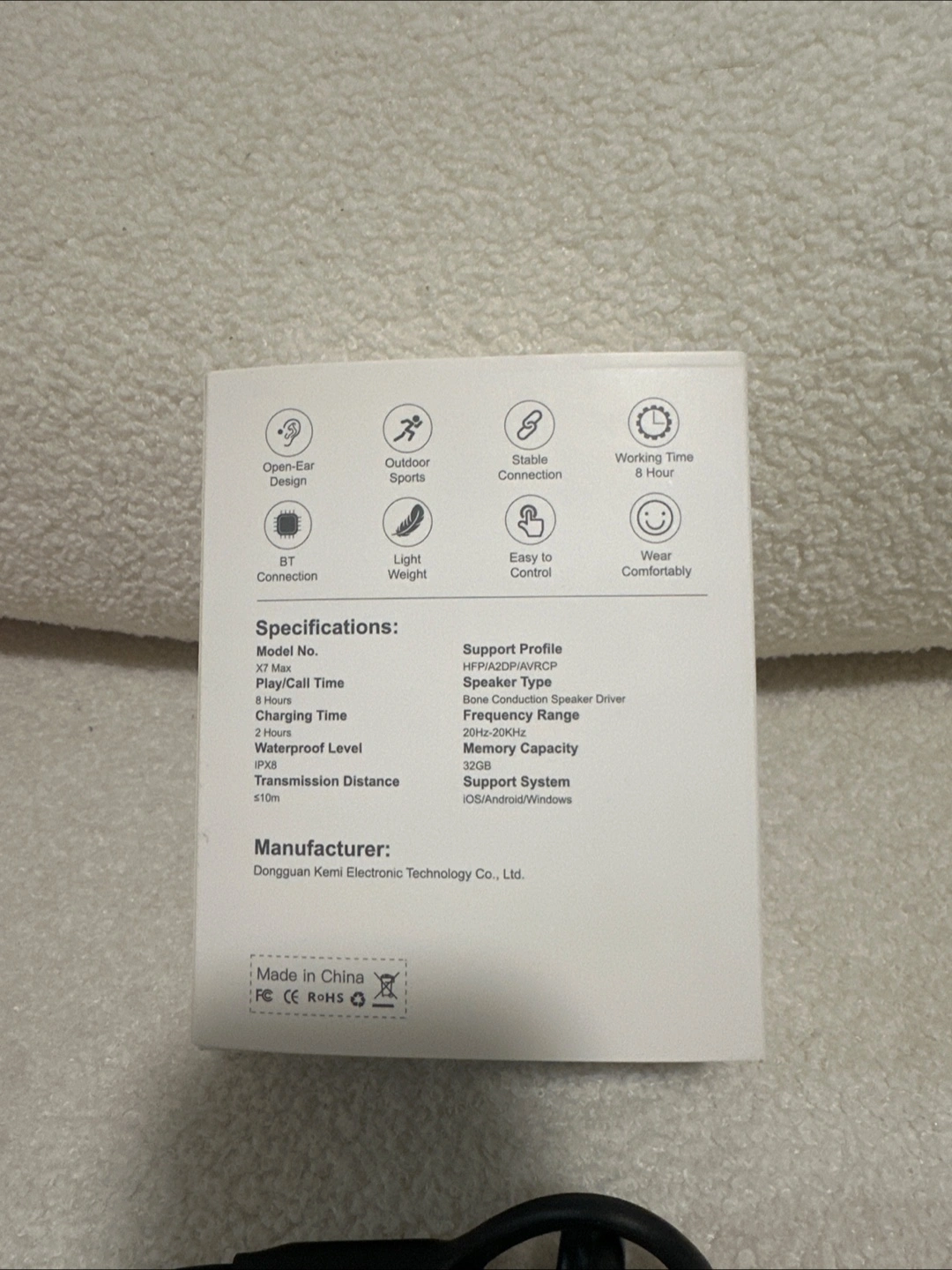 These are bone conduction motion headphones. They're black and waterproof. They provide 8 hours of working time and have a transmission distance of up to 10m.