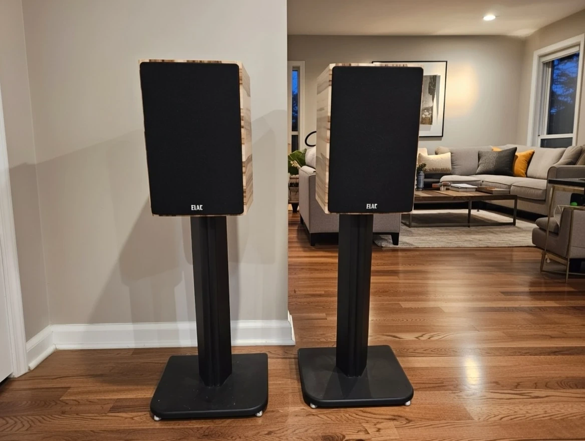 These are ELAC Debut by Andrew Jones B6 bookshelf speakers. They're designed in California and assembled in China. Model DB61-BK. Comes with speaker stands.