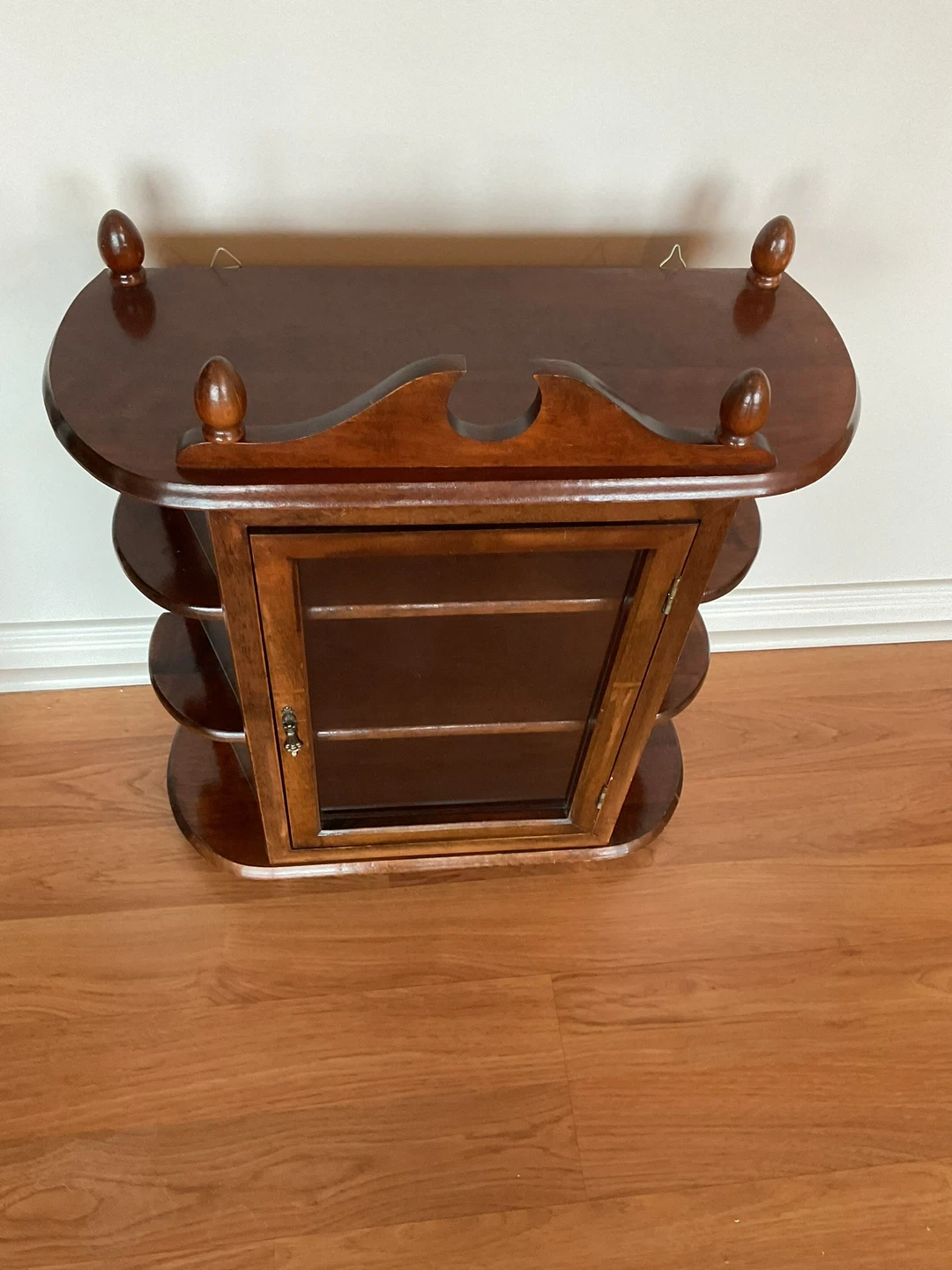 This wooden display cabinet features a glass door and multiple shelves for showcasing collectibles or decor. It's a classic piece with a rich wood finish. It has a decorative top and sides with curio shelves.