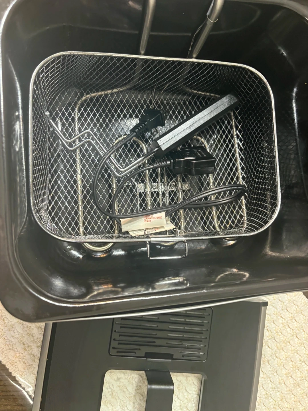 This is a Toastmaster deep fryer. It has a temperature control dial and a ready indicator light. It includes a basket with a handle for easy lifting.