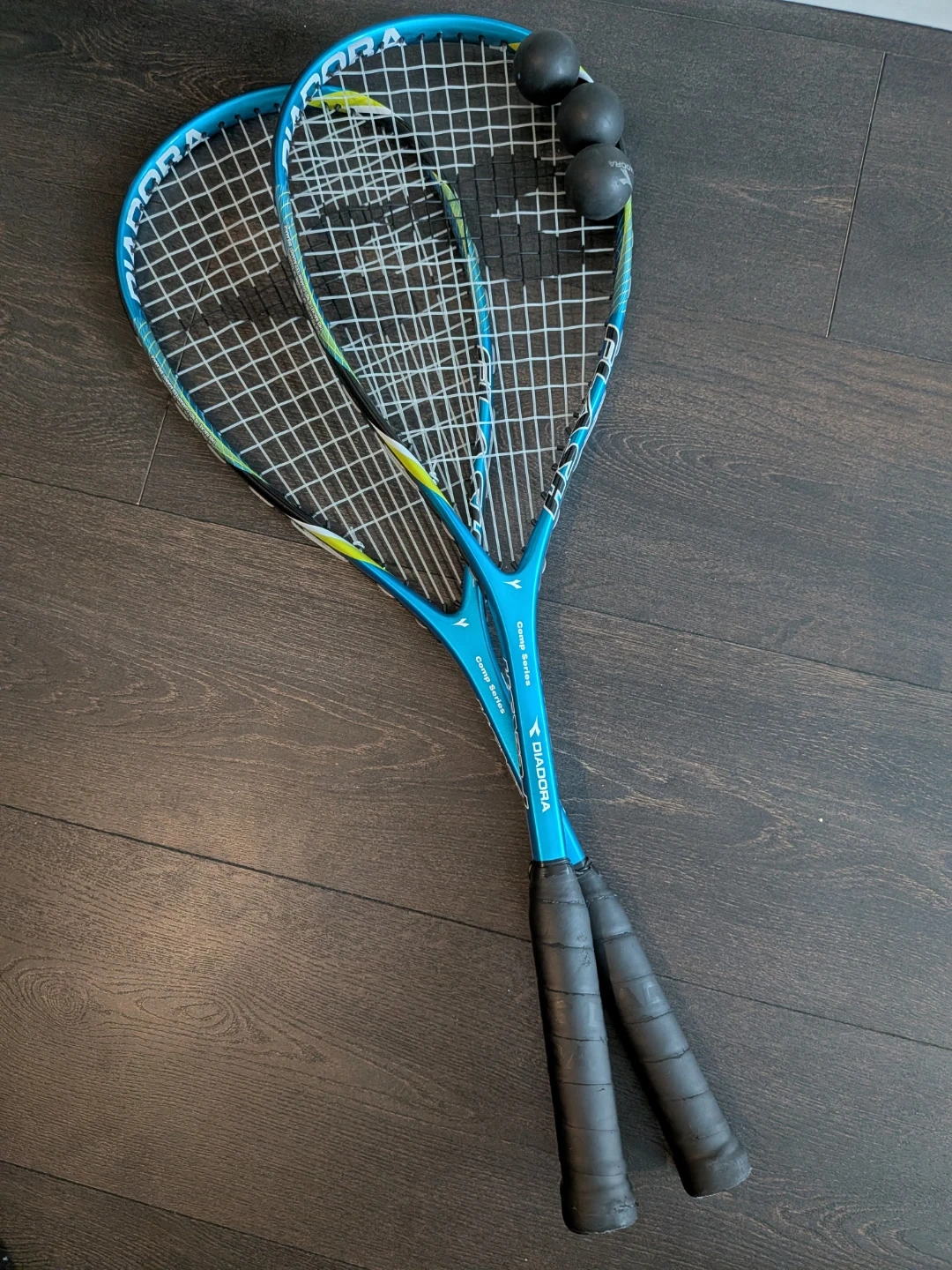Two Diadora squash rackets are included with three squash balls. These rackets are from the Comp Series. They have blue frames and black grips.