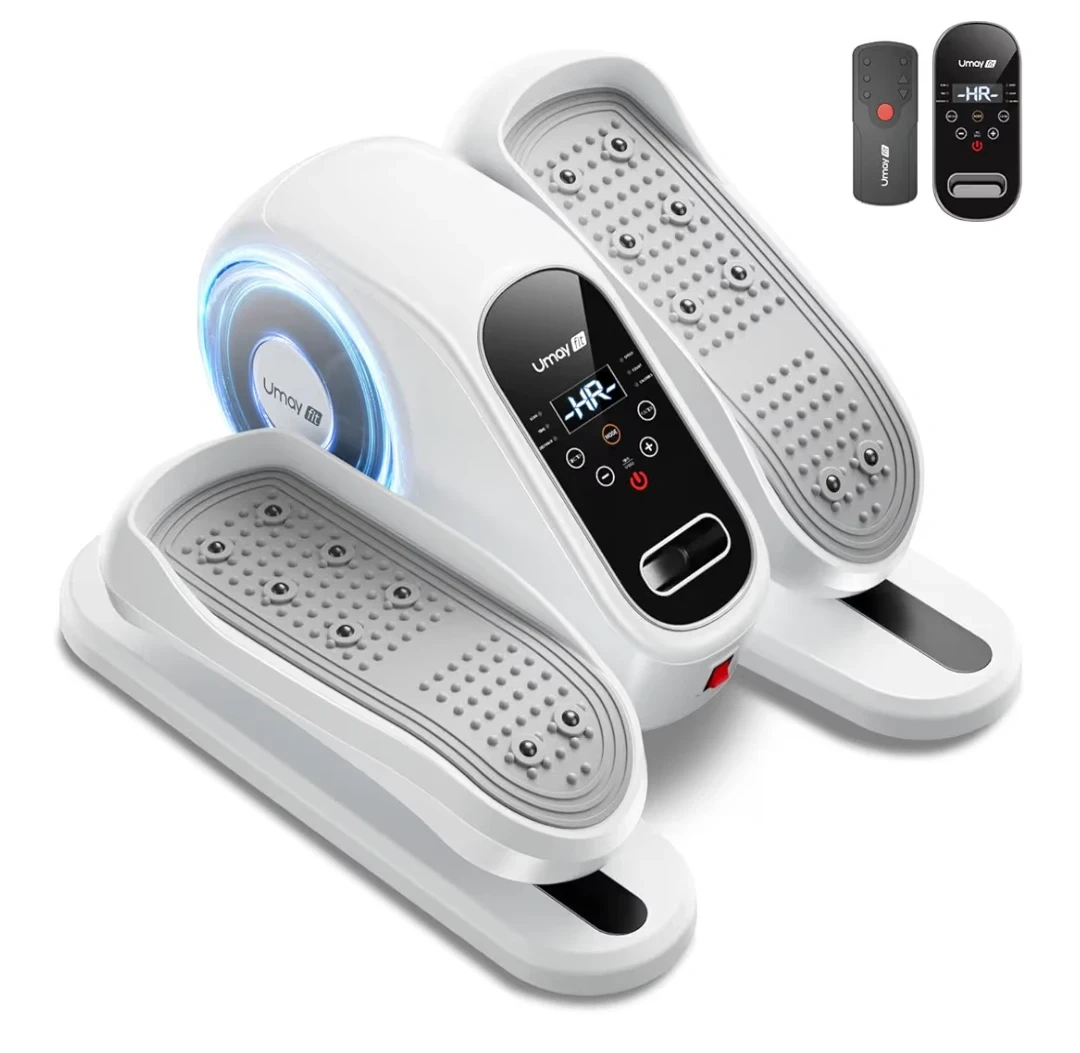 This Umay Fit under-desk elliptical is grey and comes with a remote. It features a digital display for tracking workout data. The foot pedals have a textured surface with massage balls.
