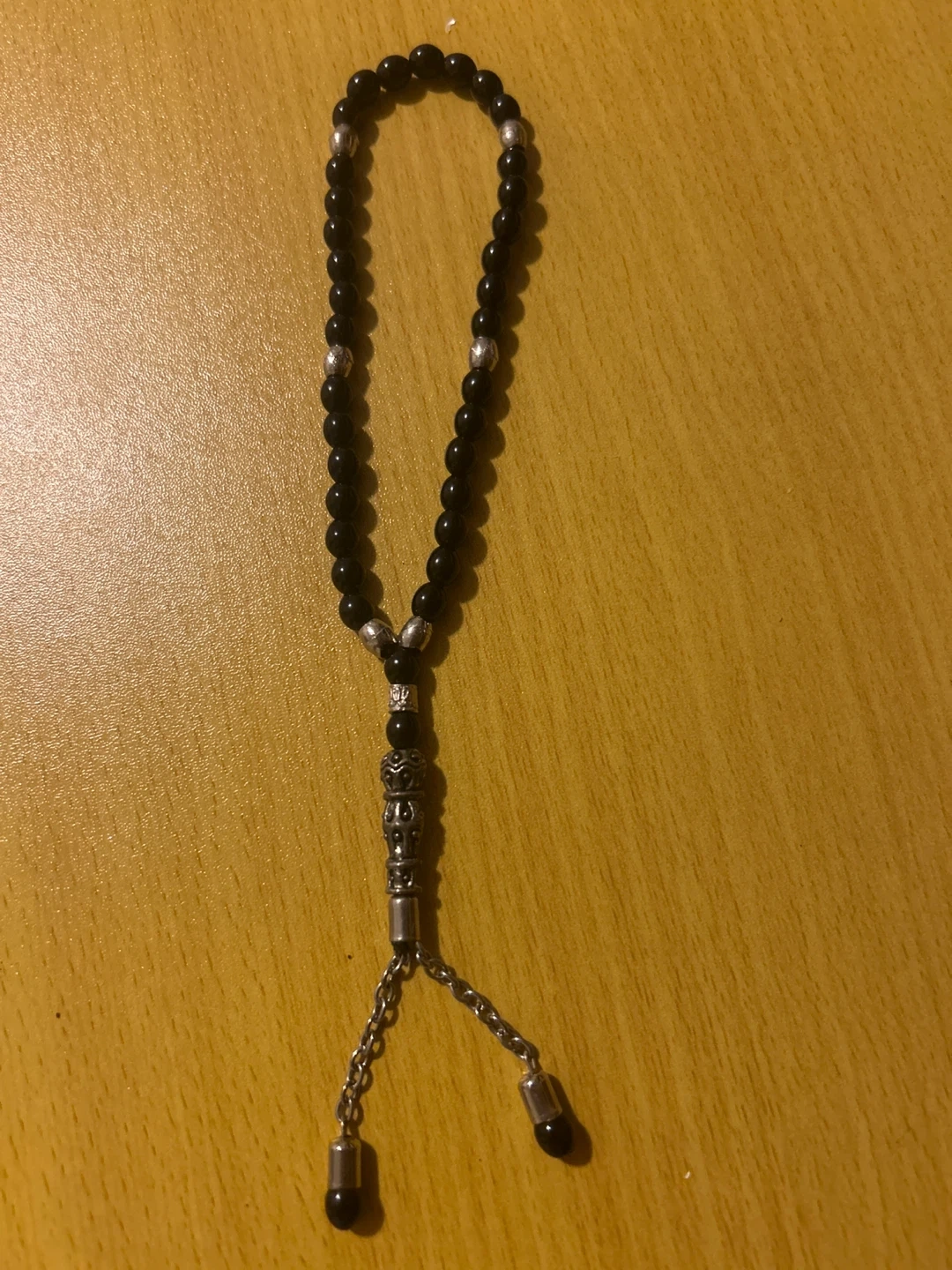 A string of black prayer beads, accented with silver-toned metal separators and a decorative tassel. These beads are suitable for prayer or as a decorative accessory. They're made with durable materials for regular use.